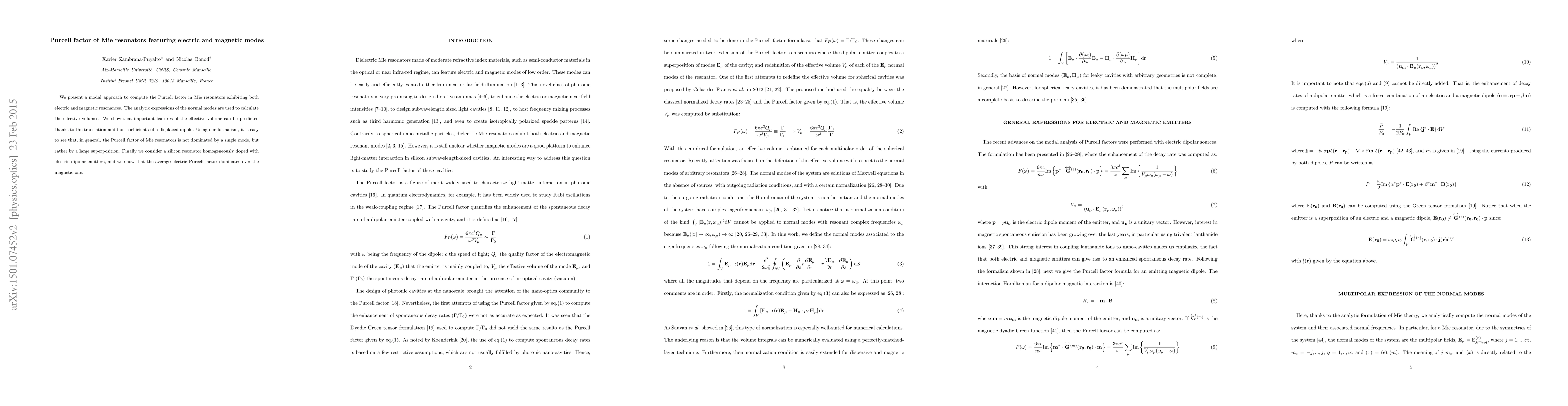 This paper presents a modal approach to calculate the Purcell factor in Mie resonators with both electric and magnetic resonances, showing that the factor is influenced by a superposition of modes rather than a single dominant mode. It also demonstrates that in silicon resonators, the average electric Purcell factor exceeds the magnetic one.