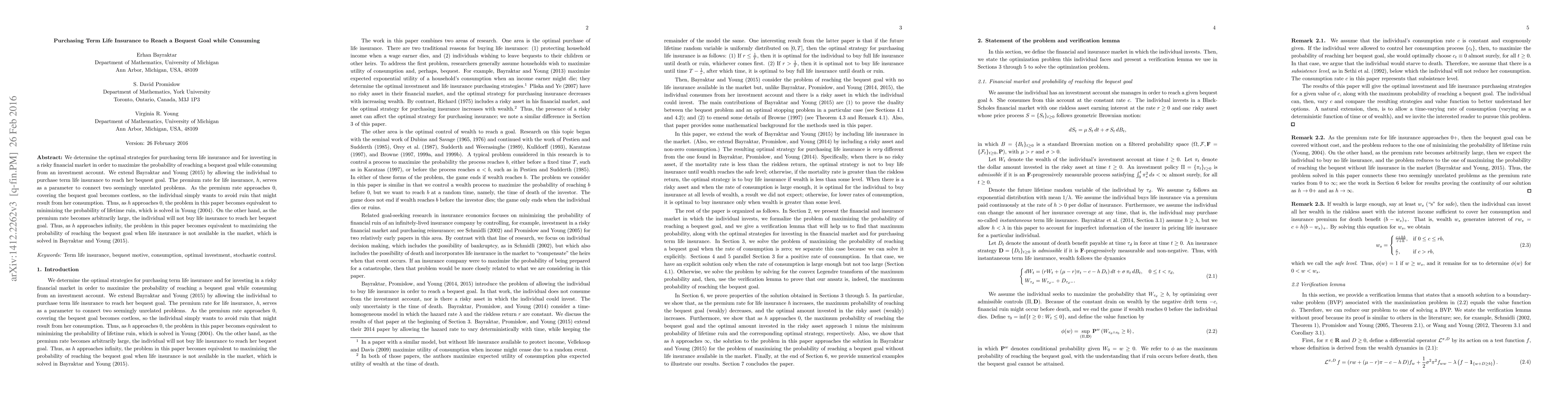 This paper explores optimal strategies for purchasing term life insurance and investing in a risky market to maximize the likelihood of achieving a bequest goal while consuming from an investment account. It extends previous work by incorporating term life insurance as a tool to reach the bequest goal, with the premium rate influencing the balance between avoiding ruin and maximizing bequest probability.