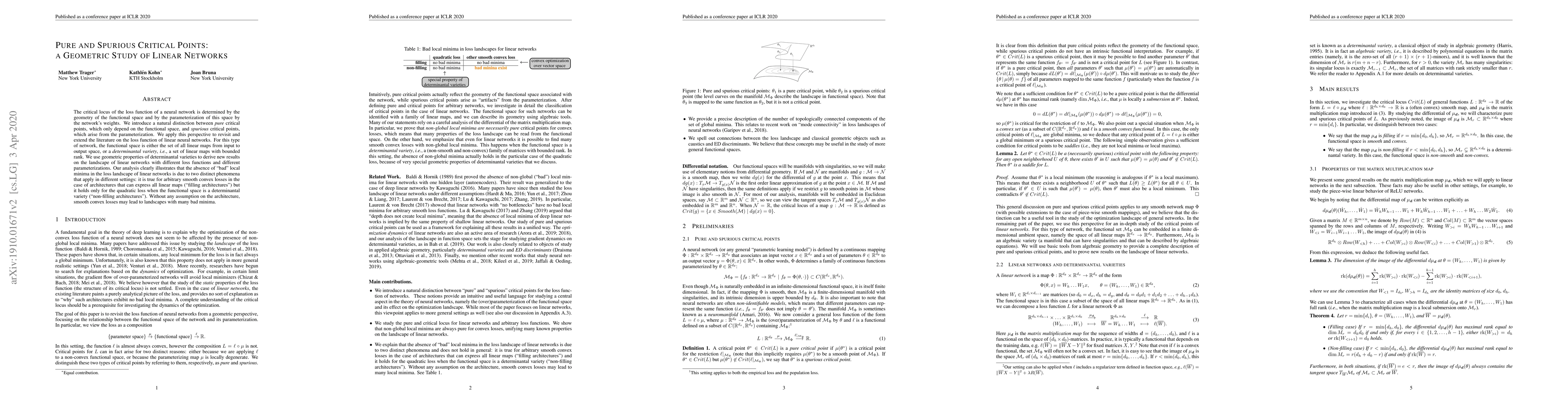 This paper distinguishes between pure and spurious critical points in the loss function of linear neural networks, attributing the absence of "bad" local minima to different phenomena depending on the network architecture and loss function. It uses geometric properties of determinantal varieties to show that "filling architectures" can handle arbitrary smooth convex losses, while "non-filling architectures" only avoid bad minima with quadratic loss.