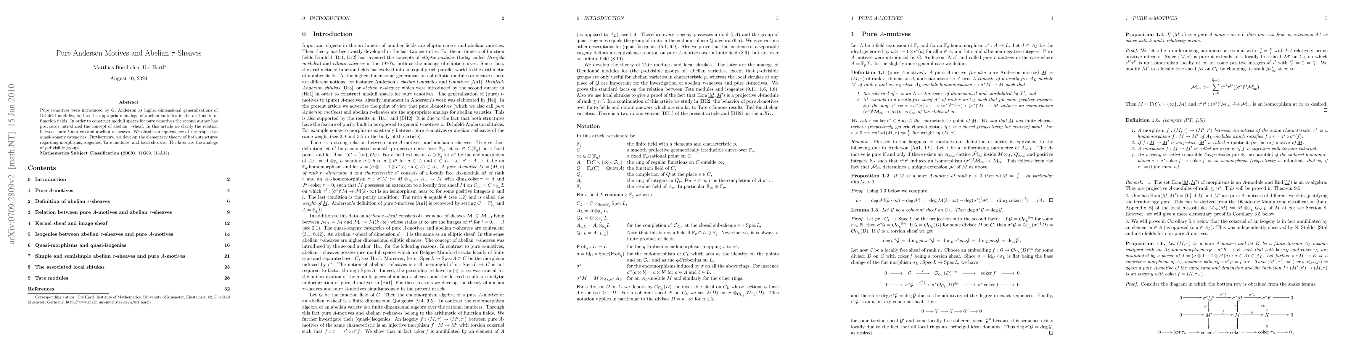 Pure t-motives were introduced by G. Anderson as higher dimensional generalizations of Drinfeld modules, and as the appropriate analogs of abelian varieties in the arithmetic of function fields. In order to construct moduli spaces for pure t-motives the second author has previously introduced the concept of abelian \tau-sheaf. In this article we clarify the relation between pure t-motives and abelian \tau-sheaves. We obtain an equivalence of the respective quasi-isogeny categories. Furthermore, we develop the elementary theory of both structures regarding morphisms, isogenies, Tate modules, and local shtukas. The later are the analogs of p-divisible groups.