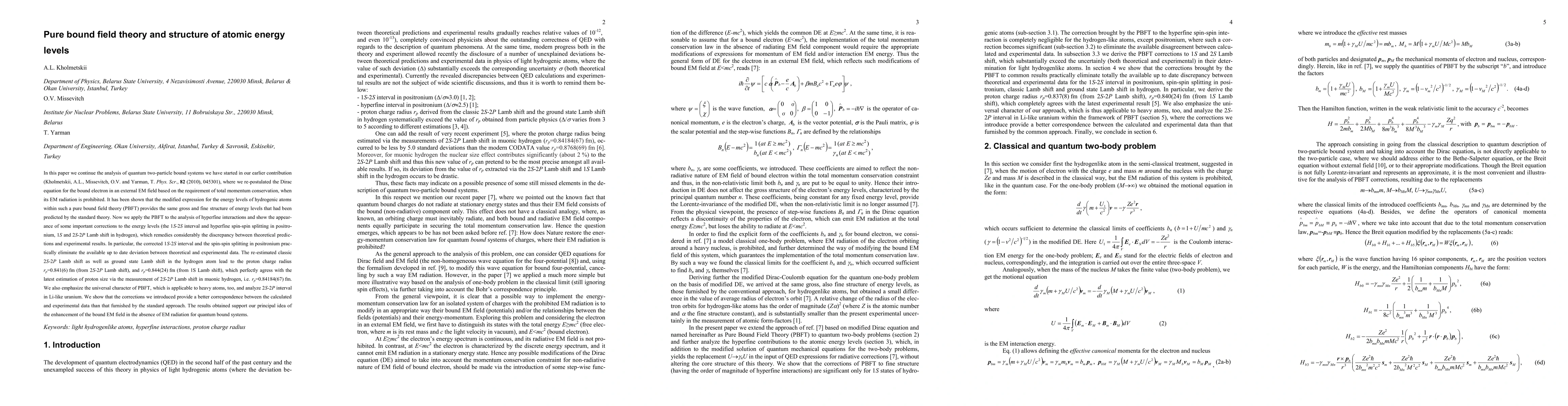 We continue the analysis of quantum two-particle bound systems we have started in (Kholmetskii, A.L., Missevitch, O.V. and Yarman, T. Phys. Scr., 82 (2010), 045301), where we re-postulated the Dirac equation for the bound electron in an external EM field based on the requirement of total momentum conservation, when its EM radiation is prohibited. It has been shown that the modified expression for the energy levels of hydrogenic atoms within such a pure bound field theory (PBFT) provides the same gross and fine structure of energy levels like the standard theory. Now we apply the PBFT to the analysis of hyperfine interactions and show the appearance of some important corrections to the energy levels (the 1S-2S interval and hyperfine spin-spin splitting in positronium, 1S and 2S-2P Lamb shift in hydrogen), which remedies considerably the discrepancy between theoretical predictions and experimental results. In particular, the corrected 1S-2S interval and the spin-spin splitting in positronium practically eliminate the available up to date deviation between theoretical and experimental data. The re-estimated classic 2S-2P Lamb shift as well as ground state Lamb shift in the hydrogen atom lead to the proton charge radius rp=0.837(8) fm (from 2S-2P Lamb shift), and rp=0.840(24) fm (from 1S Lamb shift), which corresponds to the latest estimation of proton size via the measurement of 2S-2P Lamb shift in muonic hydrogen, i.e. rp=0.84184(67) fm. We also emphasize the universal character of PBFT, which is applicable to heavy atoms, too, and analyze 2S-2P interval in Li-like uranium. We show that the corrections we introduced provide a better correspondence between the calculated and experimental data than that furnished by the standard approach. The results obtained support our principal idea of the enhancement of the bound EM field in the absence of EM radiation for quantum bound systems.