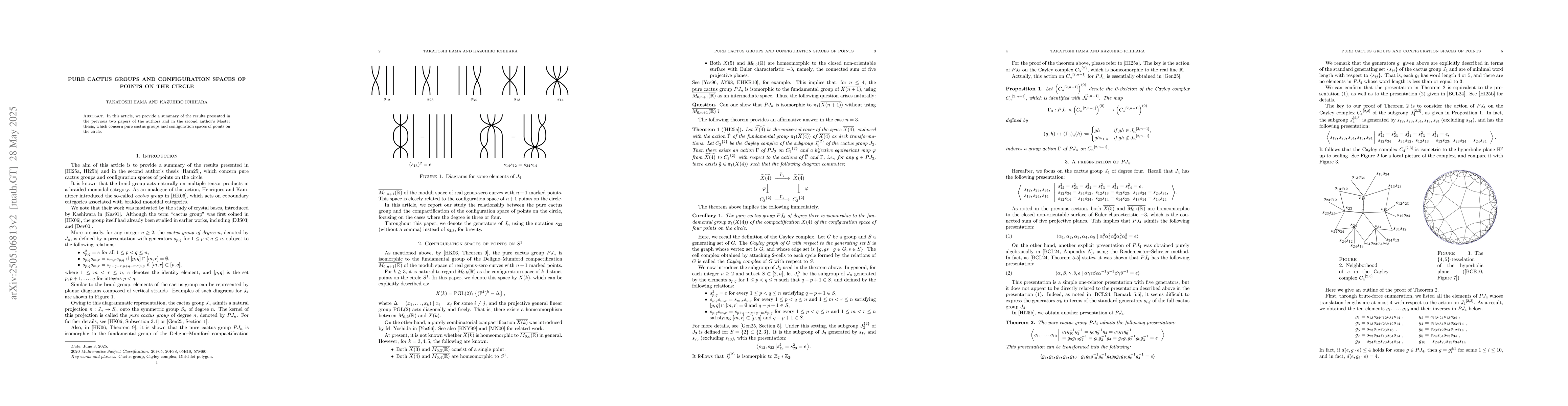 In this article, we provide a summary of the results presented in the previous two papers of the authors and in the second author's Master thesis, which concern pure cactus groups and configuration spaces of points on the circle.