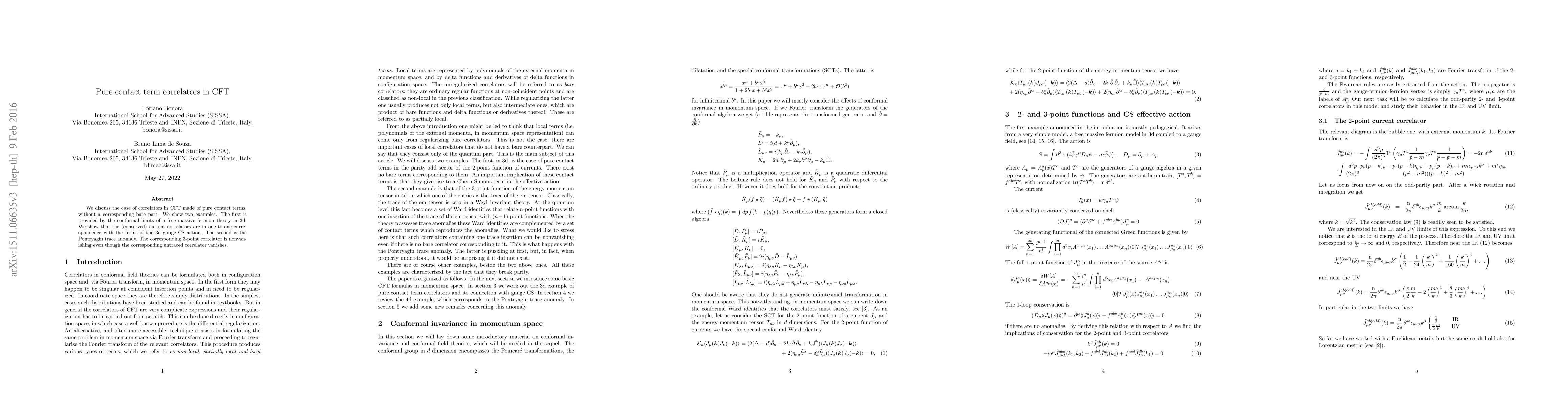 We discuss the case of correlators in CFT made of pure contact terms, without a corresponding bare part. We show two examples. The first is provided by the conformal limits of a free massive fermion theory in 3d. We show that the (conserved) current correlators are in one-to-one correspondence with the terms of the 3d gauge CS action. The second is the Pontryagin trace anomaly. The corresponding 3-point correlator is nonvanishing even though the corresponding untraced correlator vanishes.