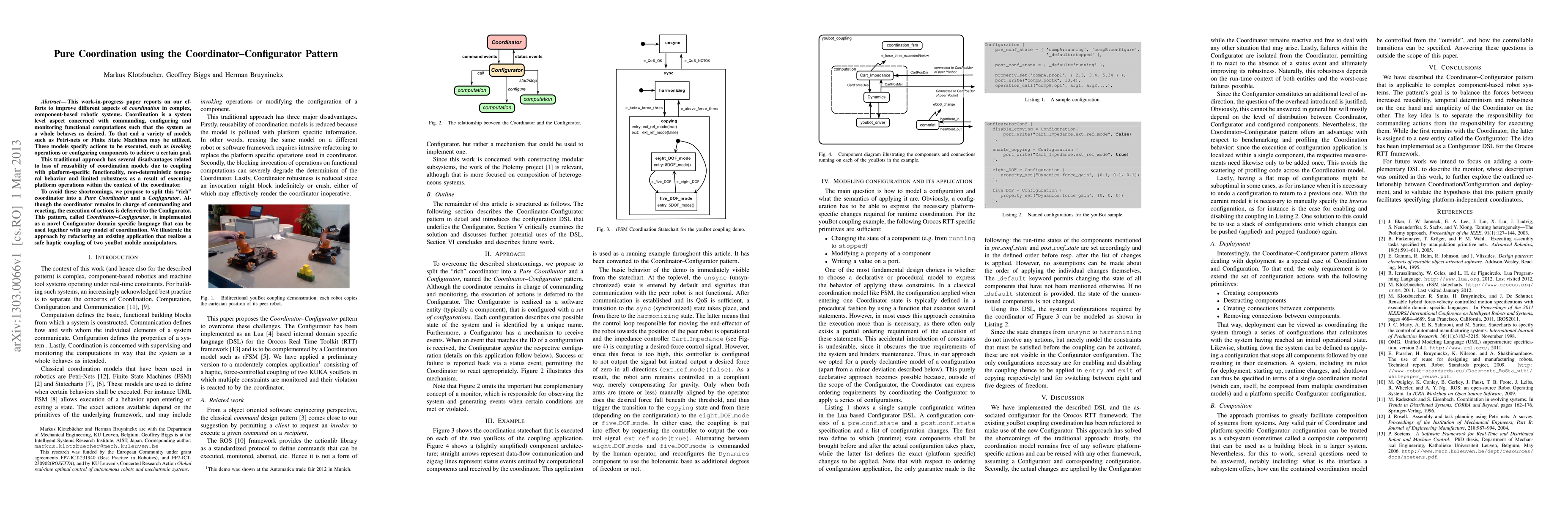 This work-in-progress paper reports on our efforts to improve different aspects of coordination in complex, component-based robotic systems. Coordination is a system level aspect concerned with commanding, configuring and monitoring functional computations such that the system as a whole behaves as desired. To that end a variety of models such as Petri-nets or Finite State Machines may be utilized. These models specify actions to be executed, such as invoking operations or configuring components to achieve a certain goal. This traditional approach has several disadvantages related to loss of reusability of coordination models due to coupling with platform-specific functionality, non-deterministic temporal behavior and limited robustness as a result of executing platform operations within the context of the coordinator. To avoid these shortcomings, we propose to split this "rich" coordinator into a Pure Coordinator and a Configurator. Although the coordinator remains in charge of commanding and reacting, the execution of actions is deferred to the Configurator. This pattern, called "Coordinator-Configurator", is implemented as a novel Configurator domain specific language that can be used together with any model of coordination. We illustrate the approach by refactoring an existing application that realizes a safe haptic coupling of two youBot mobile manipulators.