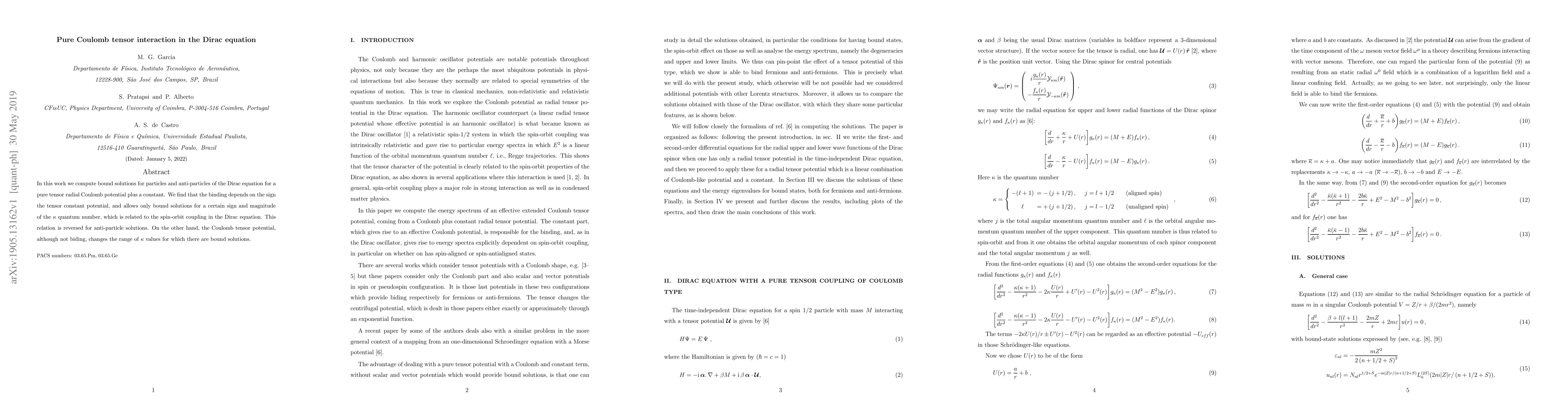 This research computes bound solutions for particles and anti-particles in the Dirac equation under a pure tensor radial Coulomb potential, revealing that binding depends on the sign of the tensor constant and the $\kappa$ quantum number, with anti-particles showing an inverse relation. The potential modifies the range of $\kappa$ values allowing bound states.