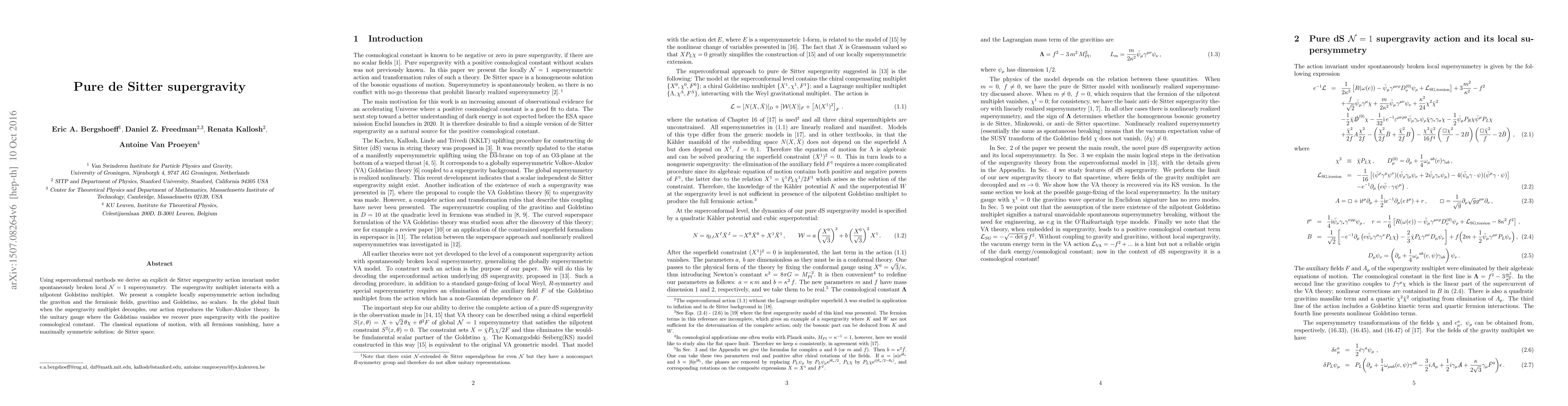 Using superconformal methods we derive an explicit de Sitter supergravity action invariant under spontaneously broken local ${\cal N}=1$ supersymmetry. The supergravity multiplet interacts with a nilpotent goldstino multiplet. We present a complete locally supersymmetric action including the graviton and the fermionic fields, gravitino and goldstino, no scalars. In the global limit when supergravity multiplet decouples, our action reproduces the Volkov-Akulov theory. In the unitary gauge where goldstino vanishes we recover pure supergravity with the positive cosmological constant. The classical equations of motion, with all fermions vanishing, have a maximally symmetric solution: de Sitter space.