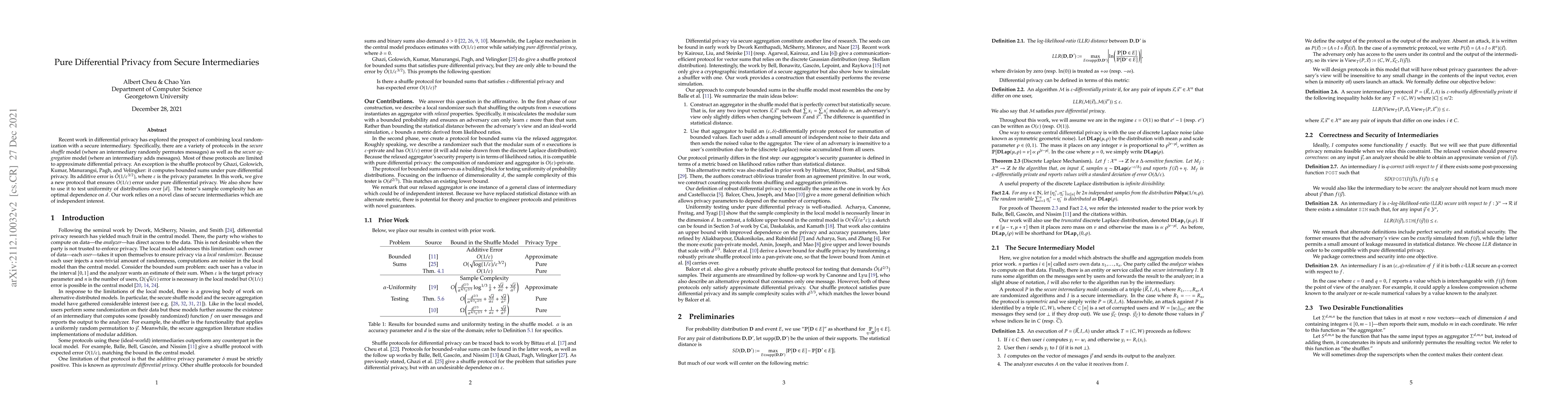 This paper introduces a new protocol for achieving pure differential privacy through secure intermediaries, offering an error rate of $O(1/\varepsilon)$ compared to the previous best of $\tilde{O}(1/\varepsilon^{3/2})$. The protocol can test uniformity of distributions over $[d]$ with optimal sample complexity.