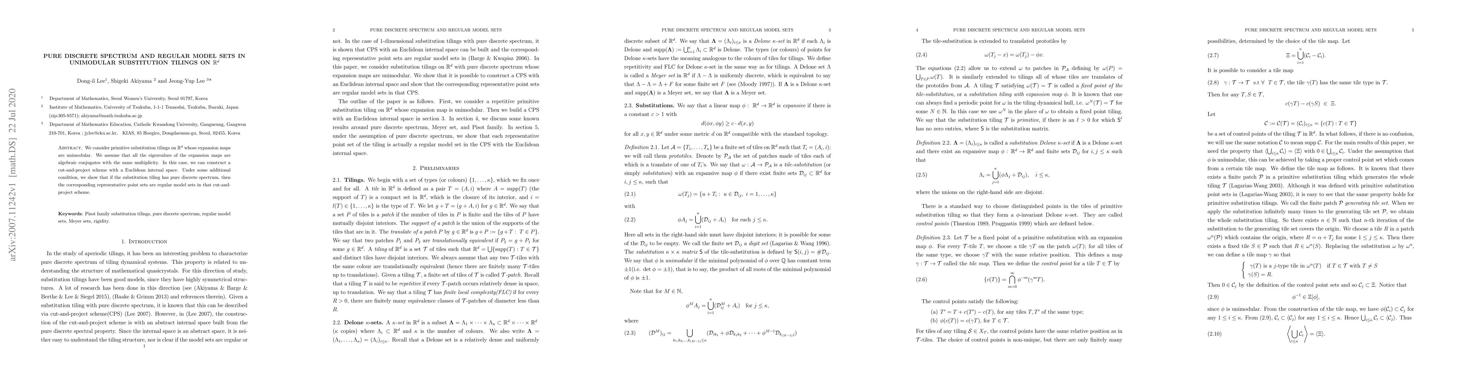 This paper investigates primitive substitution tilings on R^d with unimodular expansion maps and equal multiplicity algebraic eigenvalues. It shows that if these tilings have a pure discrete spectrum, the associated point sets form regular model sets in a cut-and-project scheme.