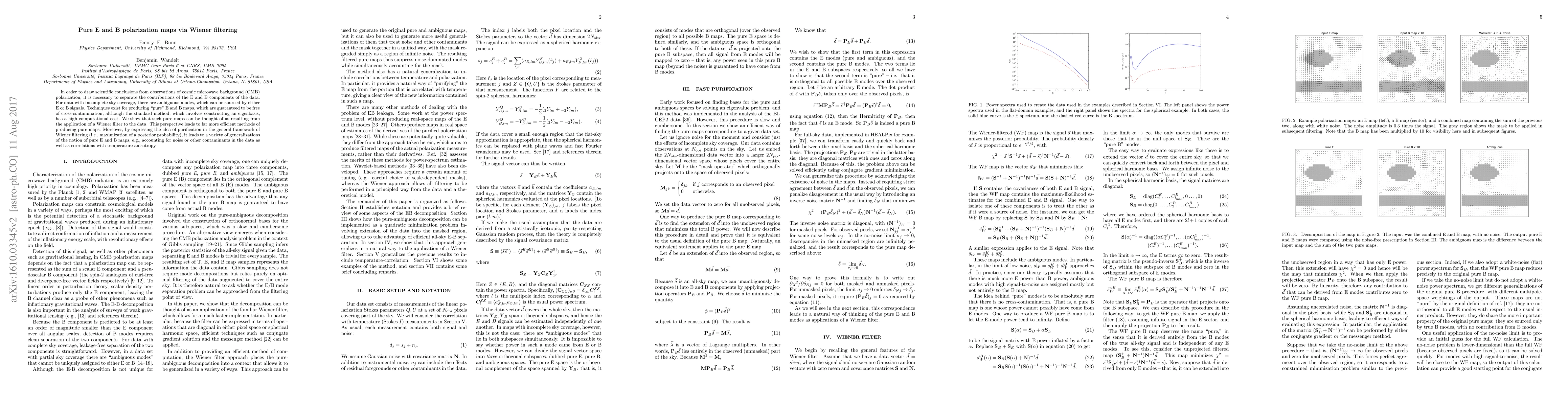 In order to draw scientific conclusions from observations of cosmic microwave background (CMB) polarization, it is necessary to separate the contributions of the E and B components of the data. For data with incomplete sky coverage, there are ambiguous modes, which can be sourced by either E or B signals. Techniques exist for producing "pure" E and B maps, which are guaranteed to be free of cross-contamination, although the standard method, which involves constructing an eigenbasis, has a high computational cost. We show that such pure maps can be thought of as resulting from the application of a Wiener filter to the data. This perspective leads to far more efficient methods of producing pure maps. Moreover, by expressing the idea of purification in the general framework of Wiener filtering (i.e., maximization of a posterior probability), it leads to a variety of generalizations of the notion of pure E and B maps, e.g., accounting for noise or other contaminants in the data as well as correlations with temperature anisotropy.