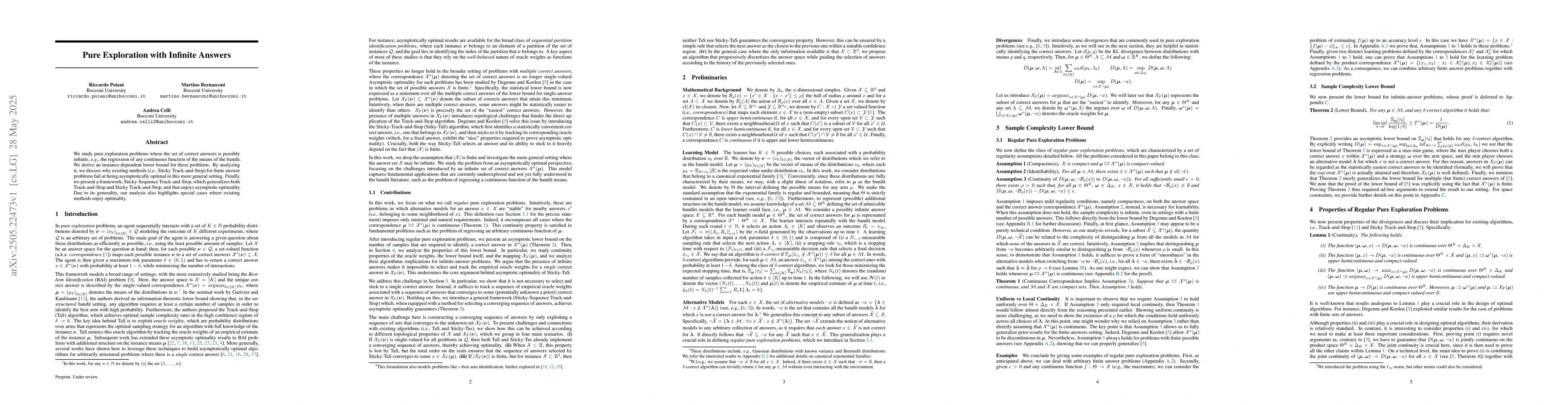 The paper derives an instance-dependent lower bound for pure exploration problems with infinite correct answers and introduces a new framework, Sticky-Sequence Track-and-Stop, to address these issues.