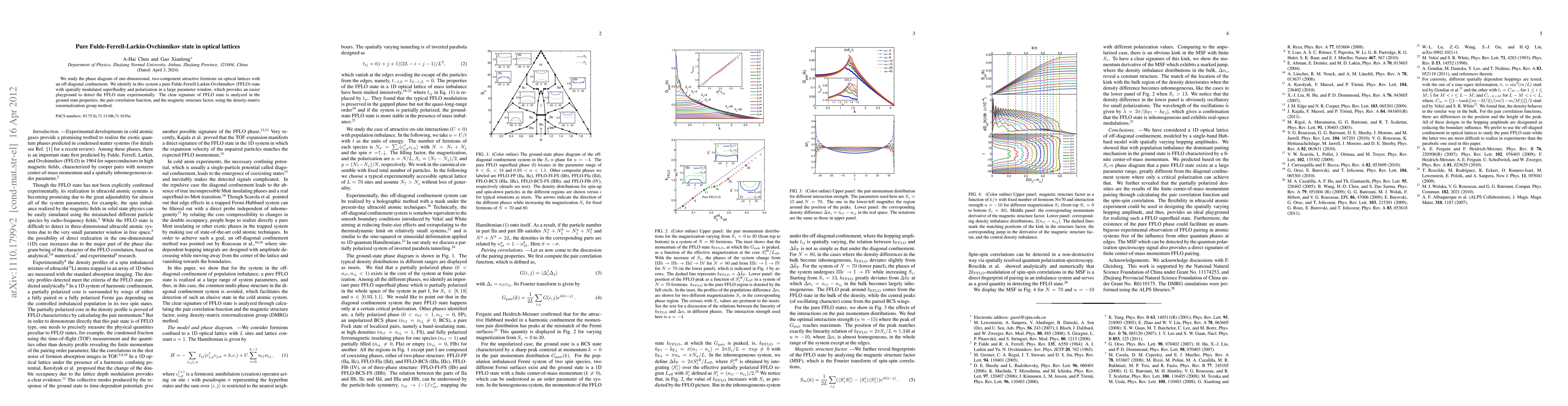 This paper investigates the phase diagram of one-dimensional, two-component attractive fermions in optical lattices, identifying a pure Fulde-Ferrell-Larkin-Ovchinnikov (FFLO) state with spatially modulated superfluidity and polarization. The study uses the density-matrix renormalization group method to analyze the FFLO state's clear signatures in ground state properties and magnetic structure factor.