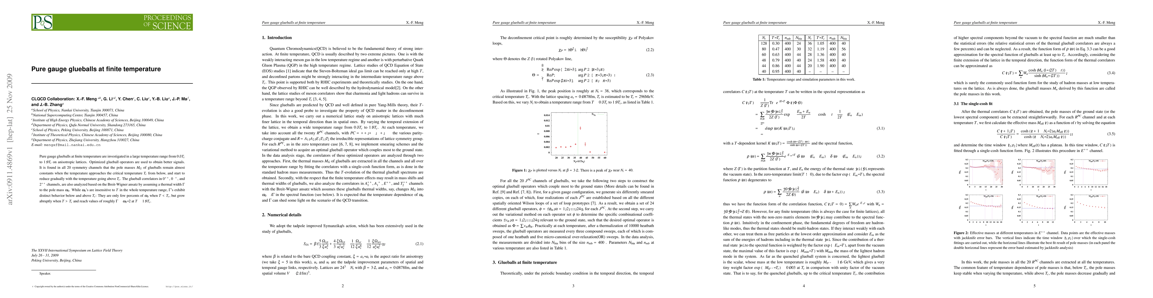This study investigates pure gauge glueballs at temperatures ranging from $0.3T_c$ to $1.9T_c$ using anisotropic lattices and optimized glueball operators. It finds that glueball pole masses remain constant until near $T_c$ and then decrease above it, while thermal widths show minimal change below $T_c$ but increase significantly above it, reaching roughly half the pole mass at $1.9T_c$.