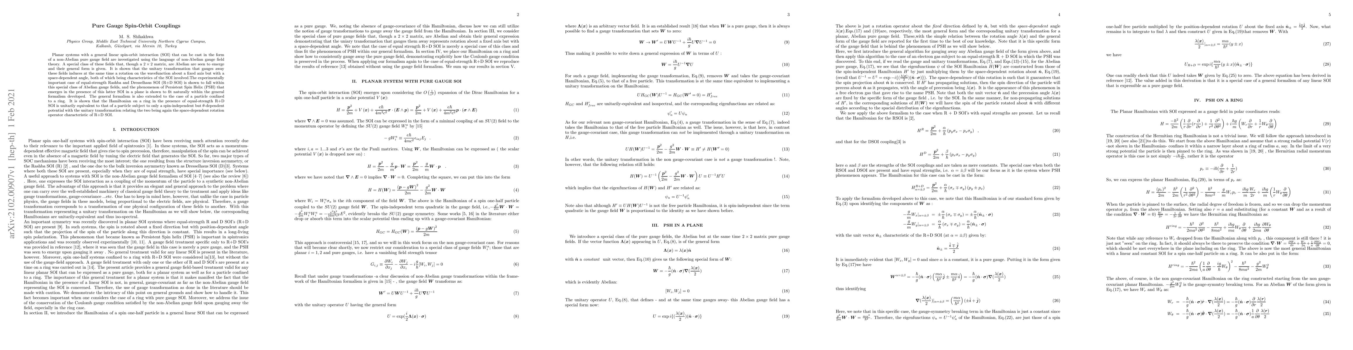 Planar systems with a general linear spin-orbit interaction (SOI) that can be cast in the form of a non-Abelian pure gauge field are investigated using the language of non-Abelian gauge field theory. A special class of these fields that, though a $2\times2$ matrix, are Abelian are seen to emerge and their general form is given. It is shown that the unitary transformation that gauges away these fields induces at the same time a rotation on the wavefunction about a fixed axis but with a space-dependent angle, both of which being characteristics of the SOI involved.The experimentally important case of equal-strength Rashba and Dresselhaus SOI (R+D SOI) is shown to fall within this special class of Abelian gauge fields, and the phenomenon of Persistent Spin Helix (PSH) that emerges in the presence of this latter SOI in a plane is shown to fit naturally within the general formalism developed. The general formalism is also extended to the case of a particle confined to a ring. It is shown that the Hamiltonian on a ring in the presence of equal-strength R+D SOI is unitarily equivalent to that of a particle subject to only a spin-independent but $\theta$-dependent potential with the unitary transformation relating the two being again the space-dependent rotation operator characteristic of R+D SOI.