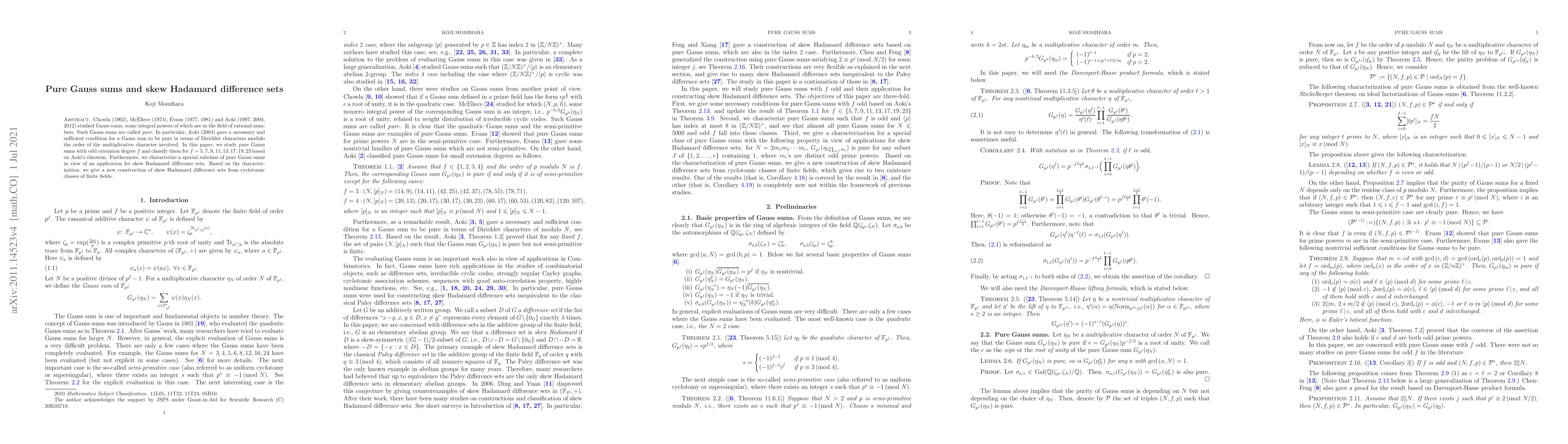 This paper investigates pure Gauss sums, classifying them for specific odd extension degrees based on Aoki's theorem, and presents a new construction method for skew Hadamard difference sets using these Gauss sums.