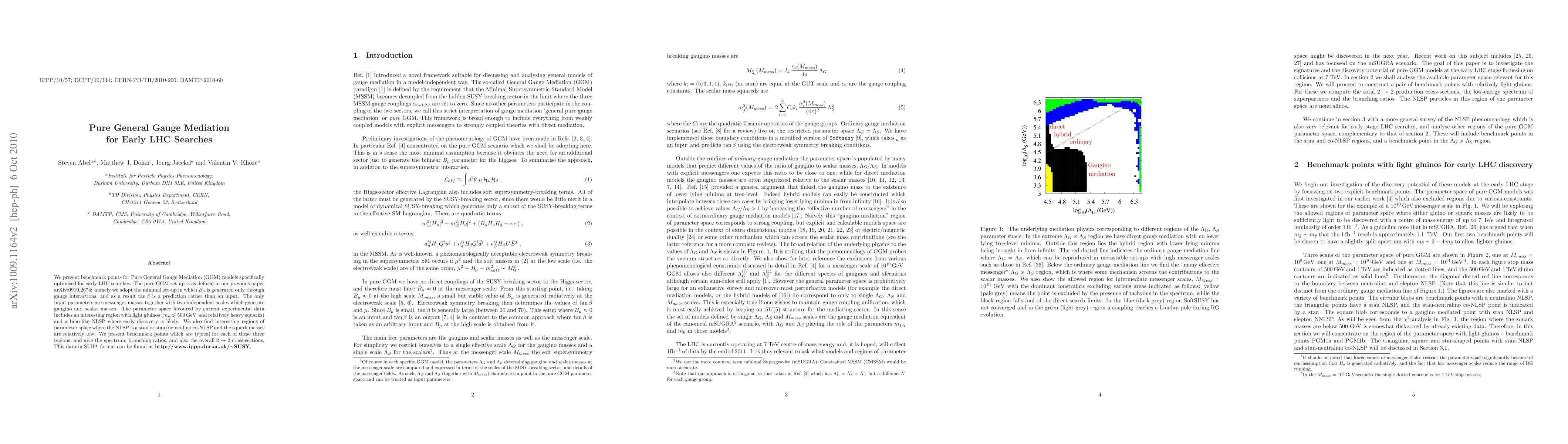We present benchmark points for Pure General Gauge Mediation (GGM) models specifically optimised for early LHC searches. The pure GGM set-up is as defined in our previous paper arXiv:0910.2674: namely we adopt the minimal set-up in which B_mu is generated only through gauge interactions, and as a result tan beta is a prediction rather than an input. The only input parameters are messenger masses together with two independent scales which generate gaugino and scalar masses. The parameter space favoured by current experimental data includes an interesting region with light gluinos (m_g < 500 GeV and relatively heavy squarks) and a bino-like NLSP where early discovery is likely. We also find interesting regions of parameter space where the NLSP is a stau or stau/neutralino co-NLSP and the squark masses are relatively low. We present benchmark points which are typical for each of these three regions, and give the spectrum, branching ratios, and also the overall 2 -> 2 cross-sections. This data in SLHA format can be found at http://www.ippp.dur.ac.uk/~SUSY