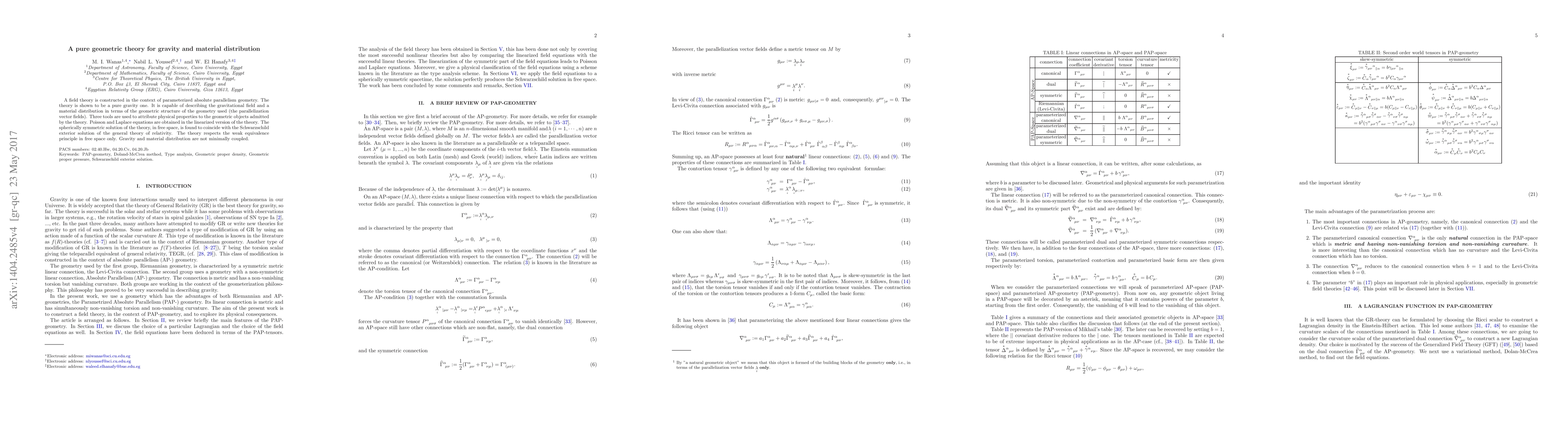 A new field theory describes gravity and material distribution using geometric structures, with a linearized version yielding Poisson and Laplace equations that coincide with general relativity's Schwarzschild solution in free space.