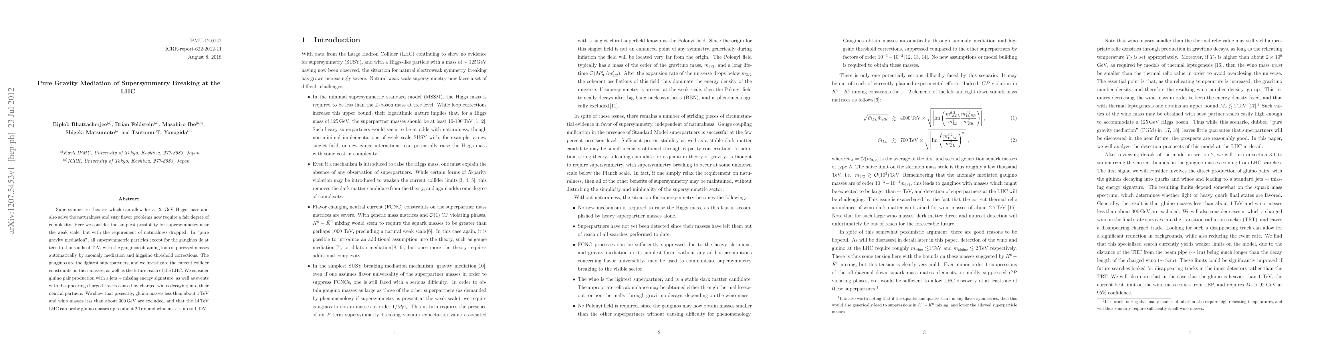 Supersymmetric theories which can allow for a 125 GeV Higgs mass and also solve the naturalness and susy flavor problems now require a fair degree of complexity. Here we consider the simplest possibility for supersymmetry near the weak scale, but with the requirement of naturalness dropped. In "pure gravity mediation", all supersymmetric particles except for the gauginos lie at tens to thousands of TeV, with the gauginos obtaining loop suppressed masses automatically by anomaly mediation and higgsino threshold corrections. The gauginos are the lightest superpartners, and we investigate the current collider constraints on their masses, as well as the future reach of the LHC. We consider gluino pair production with a jets + missing energy signature, as well as events with disappearing charged tracks caused by charged winos decaying into their neutral partners. We show that presently, gluino masses less than about 1 TeV and wino masses less than about 300 GeV are excluded, and that the 14 TeV LHC can probe gluino masses up to about 2 TeV and wino masses up to 1 TeV.