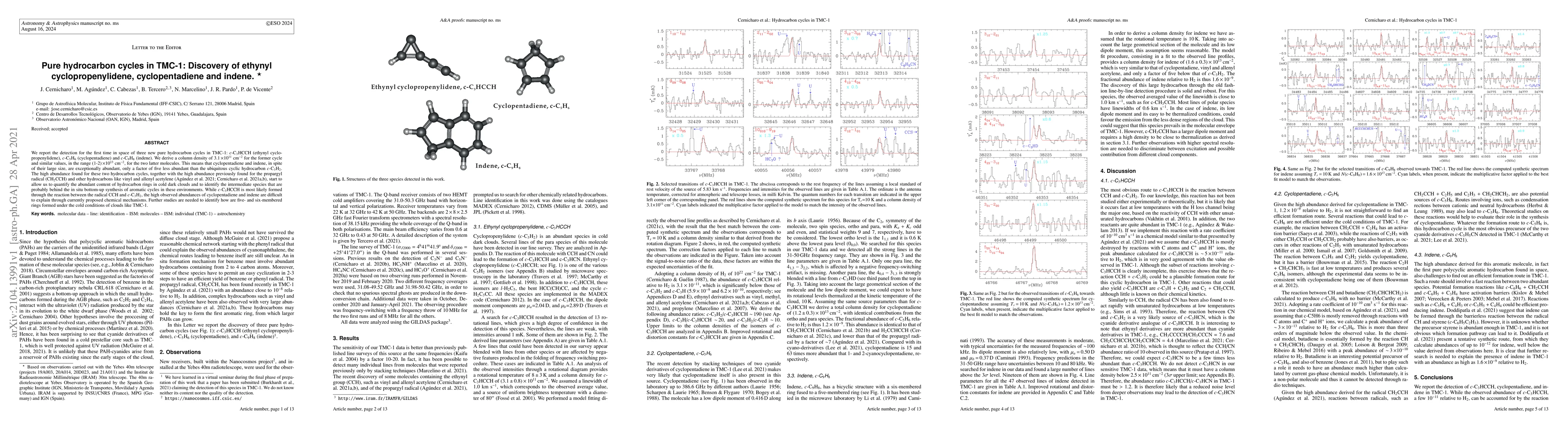 This paper reports the first detection of three new pure hydrocarbon cycles in space within TMC-1: ethynyl cyclopropenylidene, cyclopentadiene, and indene. The findings suggest these large hydrocarbon rings are surprisingly abundant, indicating a need for new chemical mechanisms to explain their formation in cold dark cloud environments.