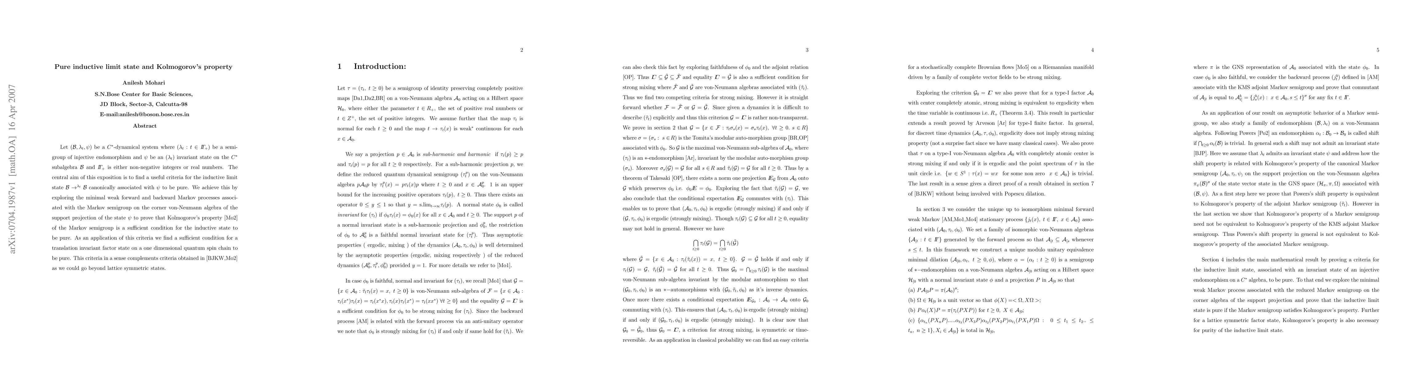 Let $(\clb,\lambda_t,\psi)$ be a $C^*$-dynamical system where $(\lambda_t: t \in \IT_+)$ be a semigroup of injective endomorphism and $\psi$ be an $(\lambda_t)$ invariant state on the $C^*$ subalgebra $\clb$ and $\IT_+$ is either non-negative integers or real numbers. The central aim of this exposition is to find a useful criteria for the inductive limit state $\clb \raro^{\lambda_t} \clb$ canonically associated with $\psi$ to be pure. We achieve this by exploring the minimal weak forward and backward Markov processes associated with the Markov semigroup on the corner von-Neumann algebra of the support projection of the state $\psi$ to prove that Kolmogorov's property [Mo2] of the Markov semigroup is a sufficient condition for the inductive state to be pure. As an application of this criteria we find a sufficient condition for a translation invariant factor state on a one dimensional quantum spin chain to be pure. This criteria in a sense complements criteria obtained in [BJKW,Mo2] as we could go beyond lattice symmetric states.