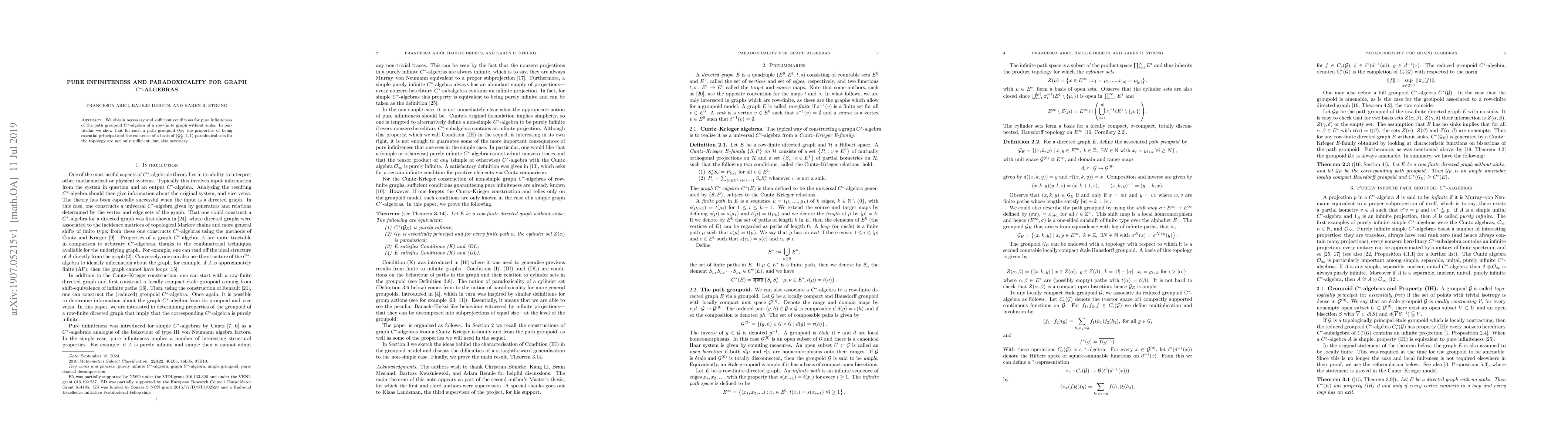 This paper establishes the necessary and sufficient conditions for the pure infiniteness of the $C^*$-algebra associated with the path groupoid of a row-finite graph without sinks. It demonstrates that essential principality and the existence of a basis of paradoxical sets are both necessary and sufficient for pure infiniteness.