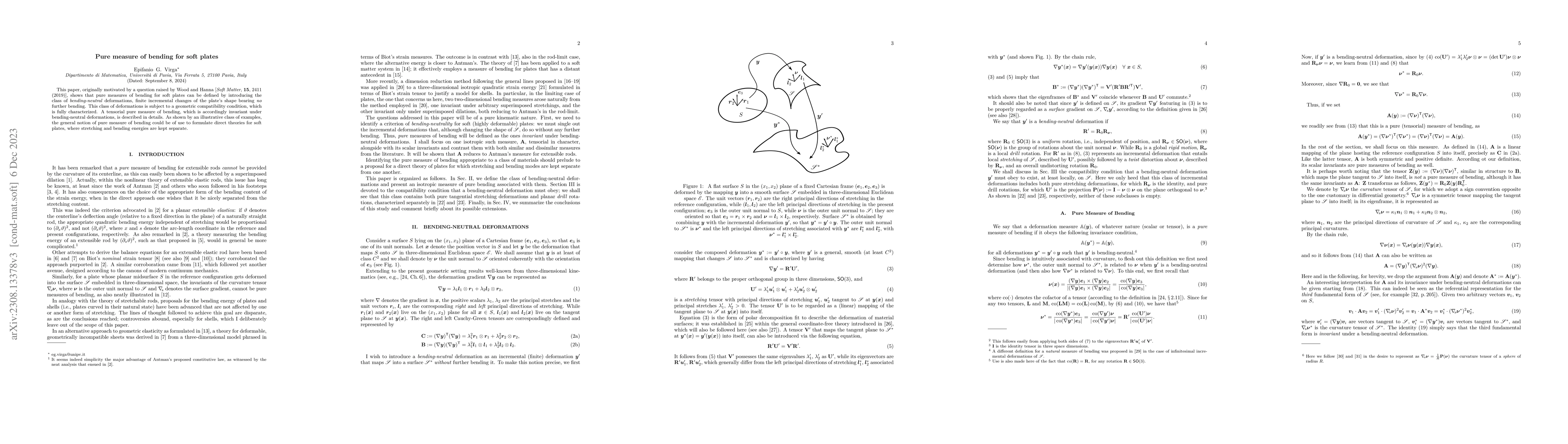 This paper, originally motivated by a question raised by Wood and Hanna [Soft Matter, 15, 2411 (2019)], shows that pure measures of bending for soft plates can be defined by introducing the class of bending-neutral deformations, finite incremental changes of the plate's shape bearing no further bending. This class of deformations is subject to a geometric compatibility condition, which is fully characterized. A tensorial pure measure of bending, which is accordingly invariant under bending-neutral deformations, is described in details. As shown by an illustrative class of examples, the general notion of pure measure of bending could be of use to formulate direct theories for soft plates, where stretching and bending energies are kept separate.