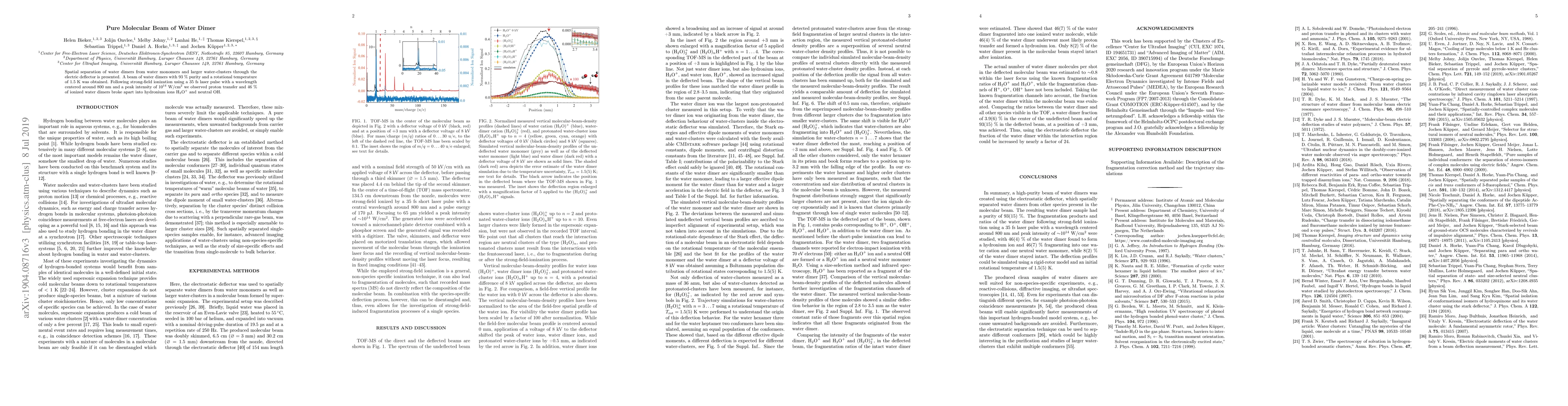 Spatial separation of water dimer from water monomer and larger water-clusters through the electric deflector is presented. A beam of water dimer with $93~\%$ purity and a rotational temperature of $1.5~$K was obtained. Following strong-field ionization using a $35~$fs laser pulse with a wavelength centered around $800~$nm and a peak intensity of $10^{14}~\text{W}/\text{cm}^2$ we observed proton transfer and $46~\%$ of the ionized water dimer broke apart into a hydronium ion $\text{H}_3\text{O}^+$ and neutral OH.