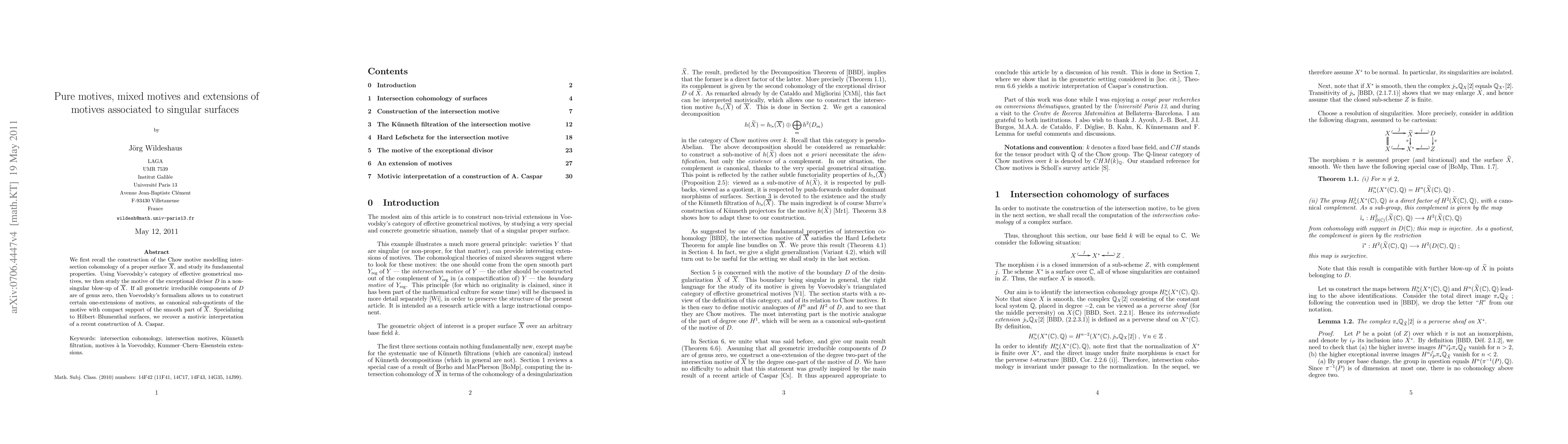 We first recall the construction of the Chow motive modelling intersection cohomology of a proper surface and study its fundamental properties. Using Voevodsky's category of effective geometrical motives, we then study the motive of the exceptional divisor in a non-singular blow-up. If all geometric irreducible components of the divisor are of genus zero, then Voevodsky's formalism allows us to construct certain one-extensions of Chow motives, as canonical sub-quotients of the motive with compact support of the smooth part of the surface. Specializing to Hilbert--Blumenthal surfaces, we recover a motivic interpretation of a recent construction of A. Caspar.