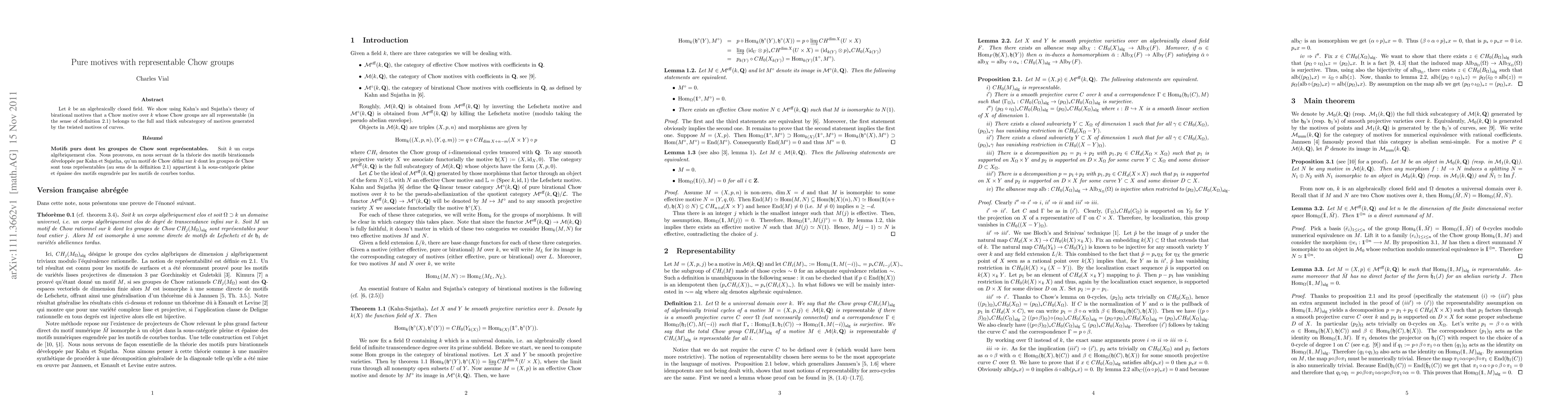 Summary: This paper proves that a Chow motive over an algebraically closed field, whose Chow groups are all representable, belongs to a specific thick subcategory of motives generated by twisted motives of curves, using Kahn and Sujatha's theory of birational motives. The result contributes to understanding the structure of pure motives in algebraic geometry.