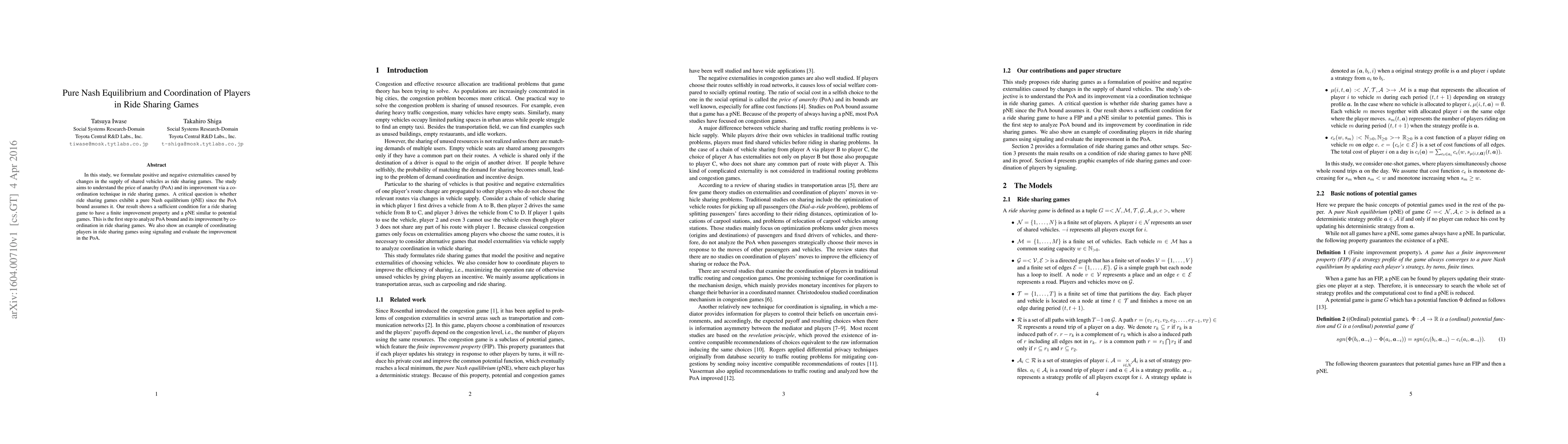 In this study, we formulate positive and negative externalities caused by changes in the supply of shared vehicles as ride sharing games. The study aims to understand the price of anarchy (PoA) and its improvement via a coordination technique in ride sharing games. A critical question is whether ride sharing games exhibit a pure Nash equilibrium (pNE) since the PoA bound assumes it. Our result shows a sufficient condition for a ride sharing game to have a finite improvement property and a pNE similar to potential games. This is the first step to analyze PoA bound and its improvement by coordination in ride sharing games. We also show an example of coordinating players in ride sharing games using signaling and evaluate the improvement in the PoA.