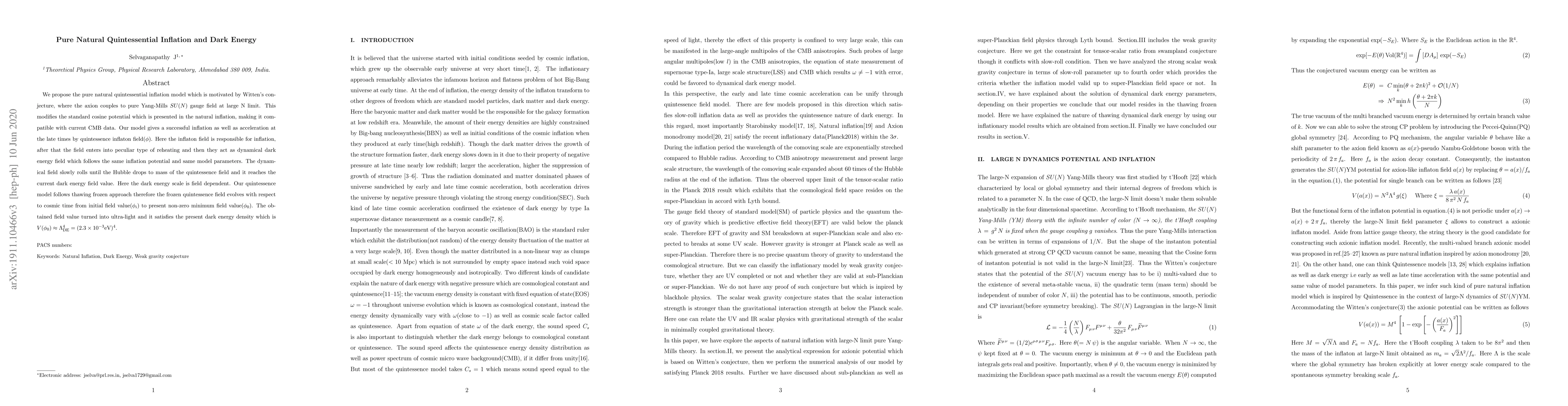 We propose the pure natural quintessential inflation model which is motivated by Witten's conjecture, where the axion couples to pure Yang-Mills $SU(N)$ gauge field at large N limit. This modifies the standard cosine potential which is presented in the natural inflation, making it compatible with current CMB data. Our model gives a successful inflation as well as acceleration at the late times by quintessence inflaton field($\phi$). Here the inflaton field is responsible for inflation, after that the field enters into peculiar type of reheating and then they act as dynamical dark energy field which follows the same inflation potential and same model parameters. The dynamical field slowly rolls until the Hubble drops to mass of the quintessence field and it reaches the current dark energy field value. Here the dark energy scale is field dependent. Our quintessence model follows thawing frozen approach therefore the frozen quintessence field evolves with respect to cosmic time from initial field value($\phi_{i}$) to present non-zero minimum field value($\phi_{0}$). The obtained field value turned into ultra-light and it satisfies the present dark energy density which is $V(\phi_{0}) \approx \Lambda_{\text{DE}}^{4} = (2.3 \times 10^{-3}\text{eV})^{4}$.
