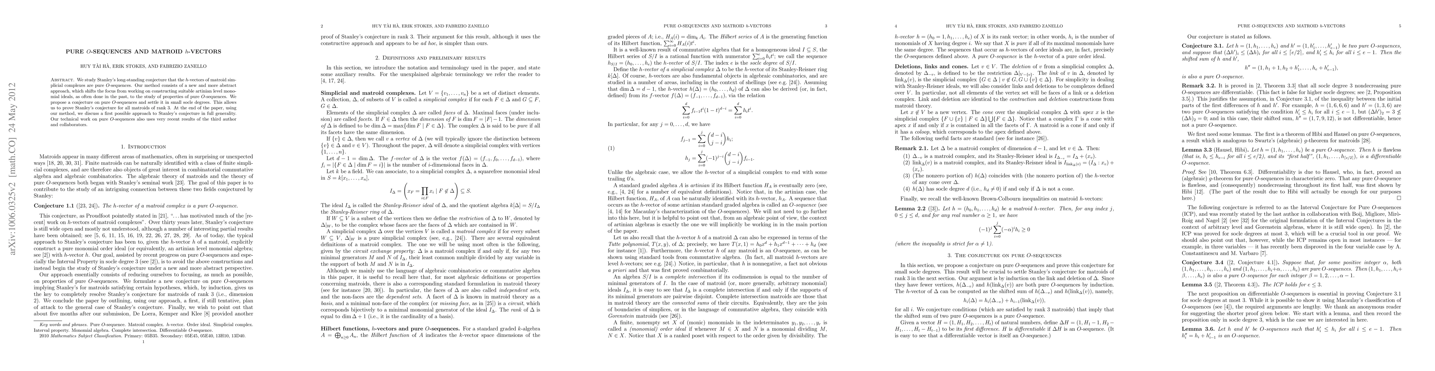 This paper investigates Stanley's conjecture regarding the purity of matroid simplicial complexes' h-vectors, shifting focus from monomial ideals to pure O-sequences. The authors prove the conjecture for matroids of rank 3 and propose a method that could extend to all matroids, leveraging recent results on pure O-sequences.
