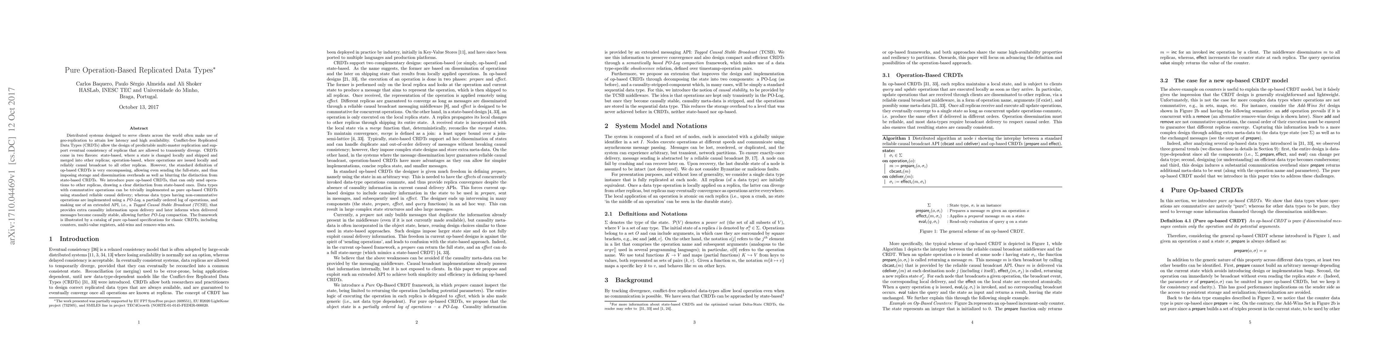 This paper introduces 'pure operation-based CRDTs' that restrict communication to operations only, distinguishing them from state-based CRDTs. It presents a framework using a PO-Log and Tagged Causal Stable Broadcast (TCSB) for non-commutative operations, illustrated with classic CRDT examples like counters and sets.