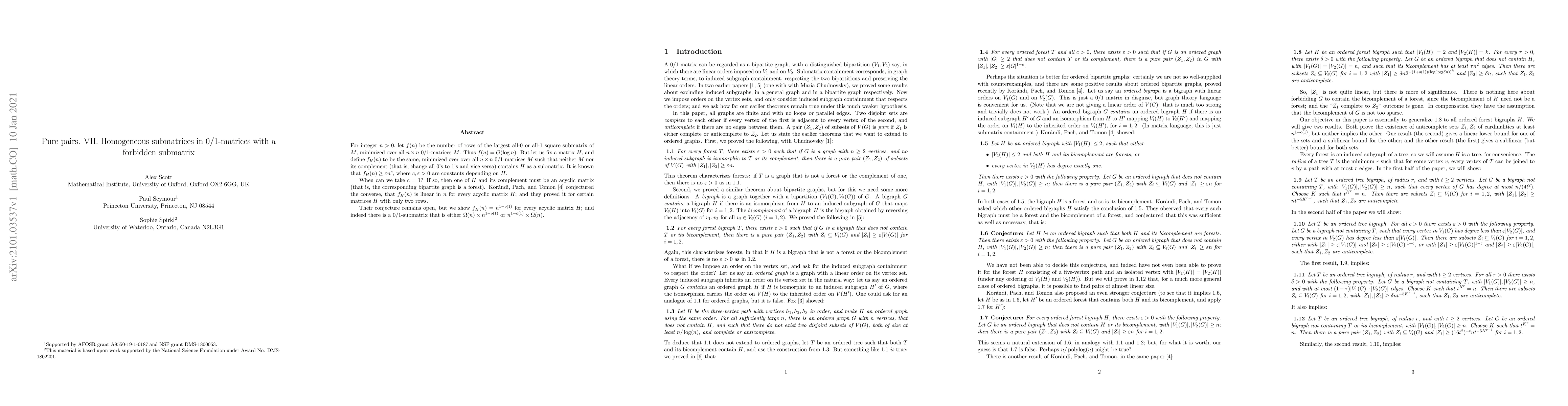 For integer $n>0$, let $f(n)$ be the number of rows of the largest all-0 or all-1 square submatrix of $M$, minimized over all $n\times n$ $0/1$-matrices $M$. Thus $f(n)= O(\log n)$. But let us fix a matrix $H$, and define $f_H(n)$ to be the same, minimized over over all $n\times n$ $0/1$-matrices $M$ such that neither $M$ nor its complement (that is, change all $0$'s to $1$'s and vice versa) contains $H$ as a submatrix. It is known that $f_H(n)\ge \epsilon n^c$, where $c, \epsilon>0$ are constants depending on $H$. When can we take $c=1$? If so, then one of $H$ and its complement must be an acyclic matrix (that is, the corresponding bipartite graph is a forest). Korandi, Pach, and Tomon conjectured the converse, that $f_H(n)$ is linear in $n$ for every acyclic matrix $H$; and they proved it for certain matrices $H$ with only two rows. Their conjecture remains open, but we show $f_H(n)=n^{1-o(1)}$ for every acyclic matrix $H$; and indeed there is a $0/1$-submatrix that is either $\Omega(n)\times n^{1-o(1)}$ or $n^{1-o(1)}\times \Omega(n)$.