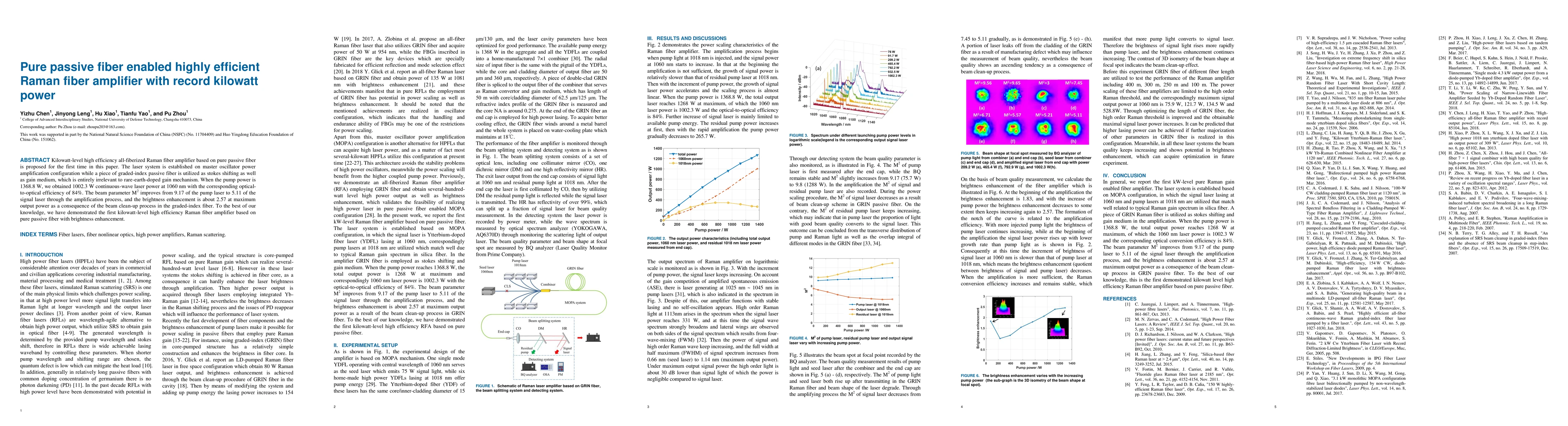 This paper proposes a highly efficient Raman fiber amplifier using pure passive fiber, achieving record kilowatt power levels. The system demonstrates an optical-to-optical efficiency of 84% and significant brightness enhancement, marking the first all-fiberized Raman amplifier of this scale based on passive fiber.