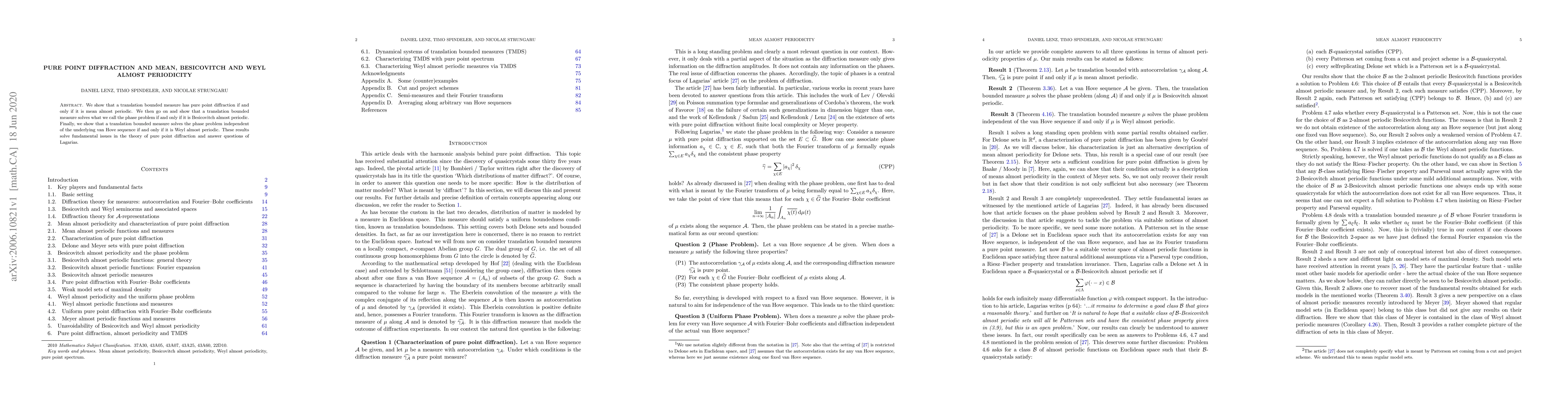 We show that a translation bounded measure has pure point diffraction if and only if it is mean almost periodic. We then go on and show that a translation bounded measure solves what we call the phase problem if and only if it is Besicovitch almost periodic. Finally, we show that a translation bounded measure solves the phase problem independent of the underlying van Hove sequence if and only if it is Weyl almost periodic. These results solve fundamental issues in the theory of pure point diffraction and answer questions of Lagarias.