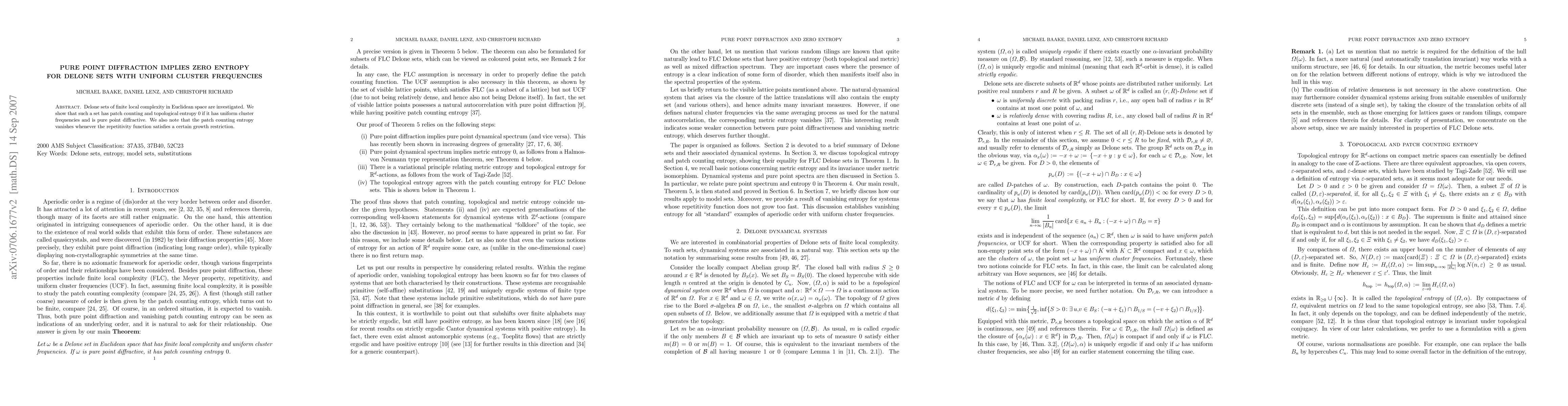 Summary: This paper demonstrates that Delone sets with uniform cluster frequencies and pure point diffraction exhibit zero entropy, including both patch counting and topological entropy. Additionally, it highlights that zero patch counting entropy occurs when the repetitivity function adheres to a specific growth condition.