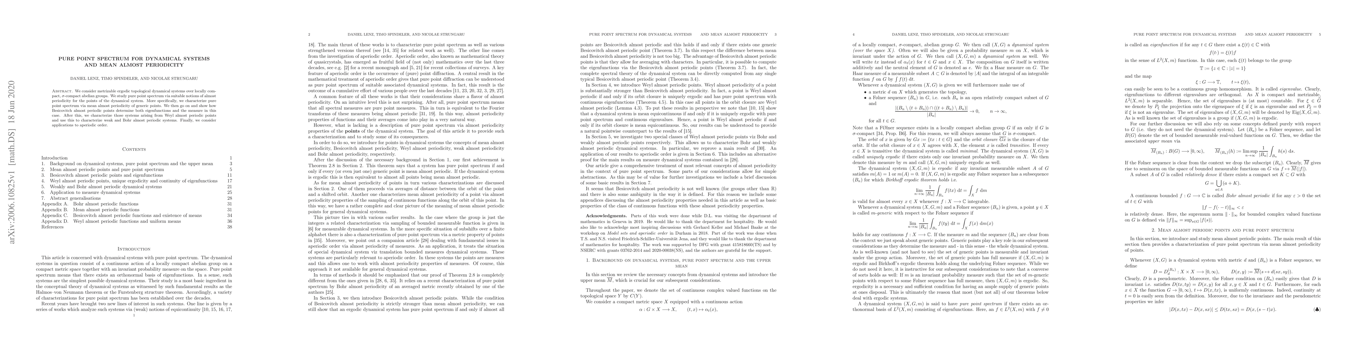 This paper explores pure point spectrum in ergodic topological dynamical systems over locally compact, $\sigma$-compact abelian groups, characterizing it through mean almost periodicity. It demonstrates how Besicovitch almost periodic points determine eigenfunctions and measures, and extends the analysis to Weyl, weak, and Bohr almost periodic systems, with applications to aperiodic order.