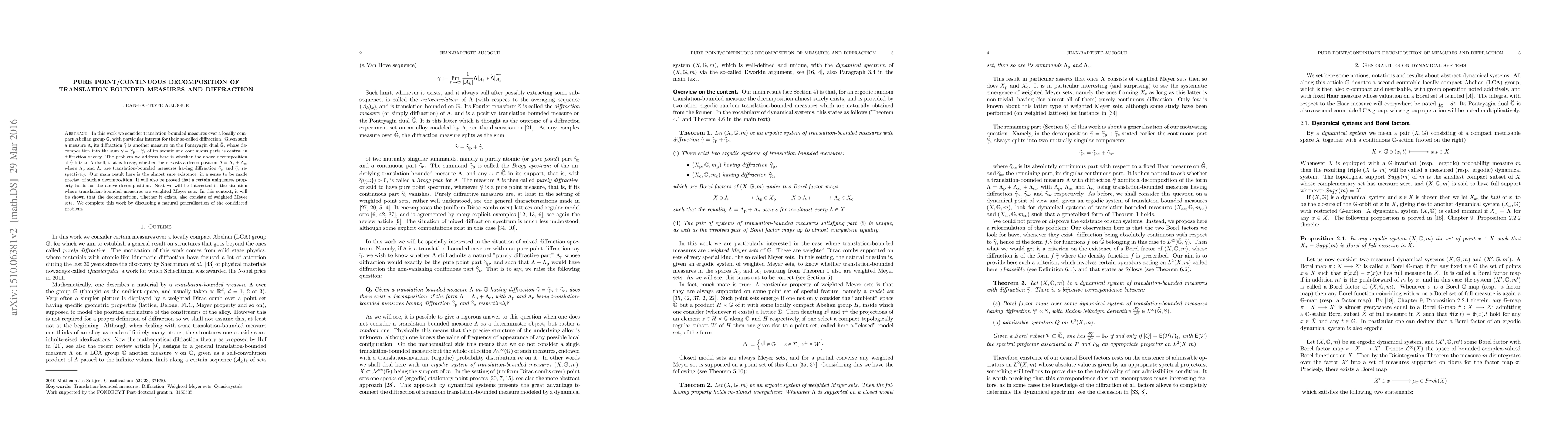 This paper investigates the decomposition of translation-bounded measures over locally compact Abelian groups into atomic and continuous parts, focusing on their diffraction properties. The main result establishes the almost sure existence of such a decomposition, with a discussion on its uniqueness and the case where measures are weighted Meyer sets.