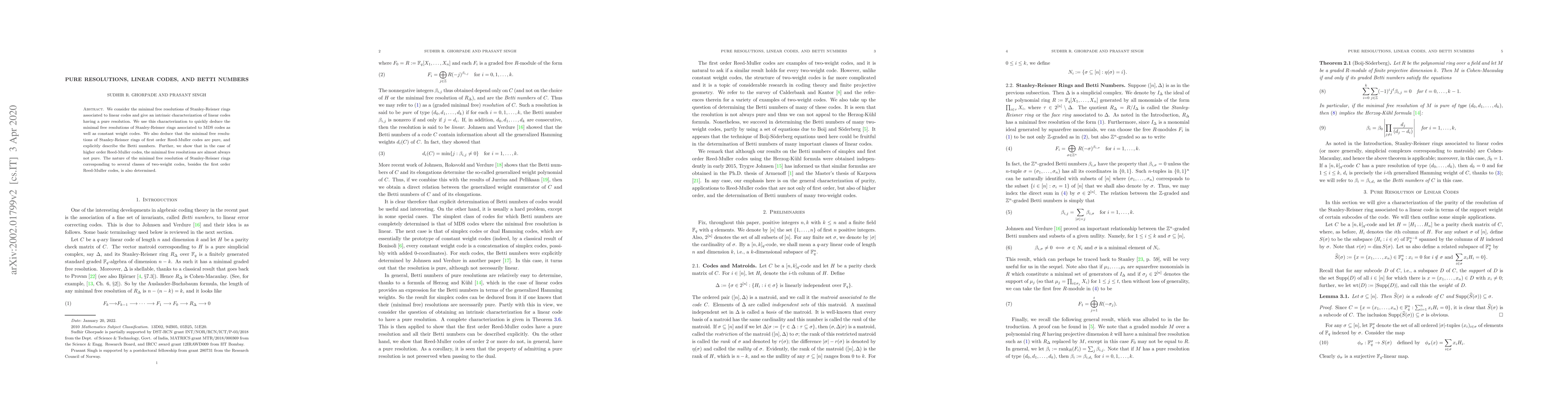 This paper characterizes linear codes with pure minimal free resolutions for Stanley-Reisner rings and deduces the resolutions for MDS and constant weight codes. It further shows that first-order Reed-Muller codes have pure resolutions and provides Betti numbers, while higher-order Reed-Muller codes generally do not. Additionally, the study determines the minimal free resolutions for several classes of two-weight codes.