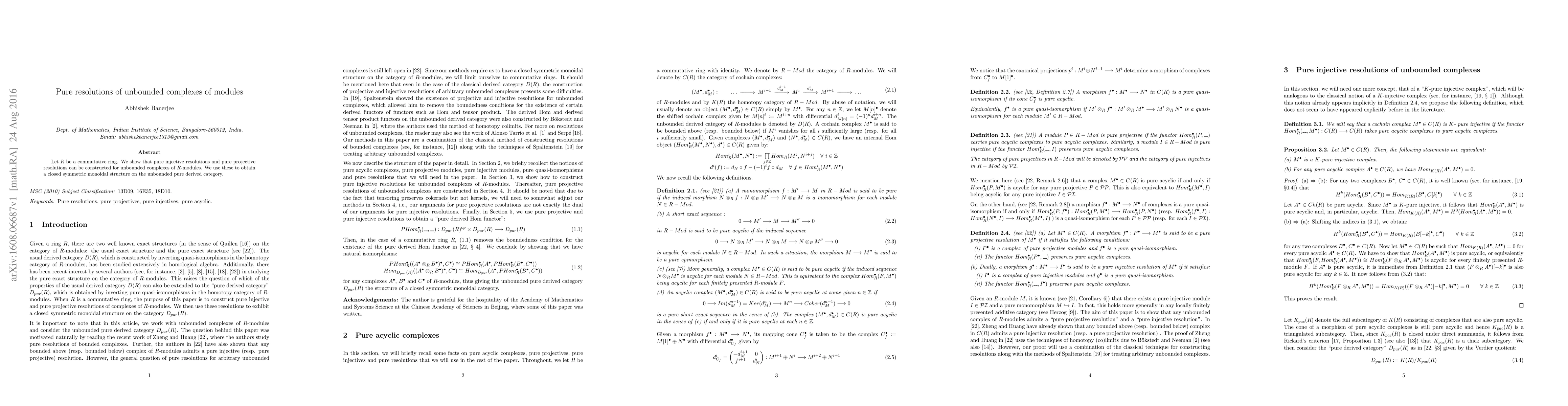 This paper demonstrates the construction of pure injective and projective resolutions for unbounded complexes of $R$-modules over a commutative ring $R$, leading to a closed symmetric monoidal structure on the unbounded pure derived category.