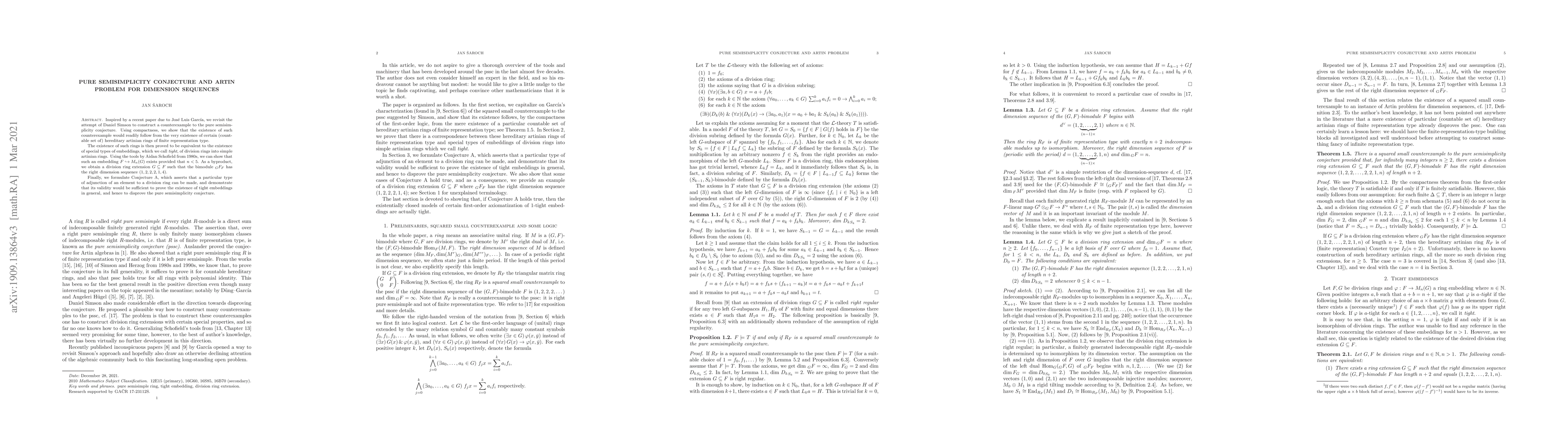 Inspired by a recent paper due to Jos\'{e} Luis Garc\'{i}a, we revisit the attempt of Daniel Simson to construct a counterexample to the pure semisimplicity conjecture. Using compactness, we show that the existence of such counterexample would readily follow from the very existence of certain (countable set of) hereditary artinian rings of finite representation type. The existence of such rings is then proved to be equivalent to the existence of special types of embeddings, which we call tight, of division rings into simple artinian rings. Using the tools by Aidan Schofield from 1980s, we can show that such an embedding $F\hookrightarrow M_n(G)$ exists provided that $n<5$. As a byproduct, we obtain a division ring extension $G\subseteq F$ such that the bimodule ${}_GF_F$ has the right dimension sequence $(1,2,2,2,1,4)$. Finally, we formulate Conjecture A, which asserts that a particular type of adjunction of an element to a division ring can be made, and demonstrate that its validity would be sufficient to prove the existence of tight embeddings in general, and hence to disprove the pure semisimplicity conjecture.
