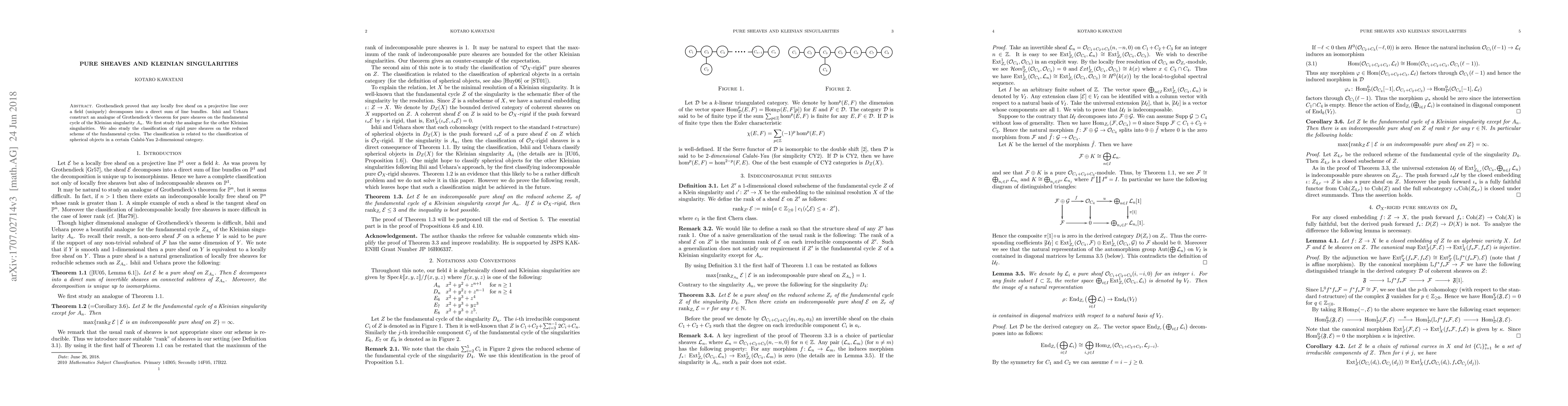 This paper extends Grothendieck's theorem on the decomposition of locally free sheaves to pure sheaves on the fundamental cycles of Kleinian singularities, specifically excluding $A_n$. It also classifies rigid pure sheaves on these cycles, linking the classification to spherical objects in a Calabi-Yau $2$-dimensional category.