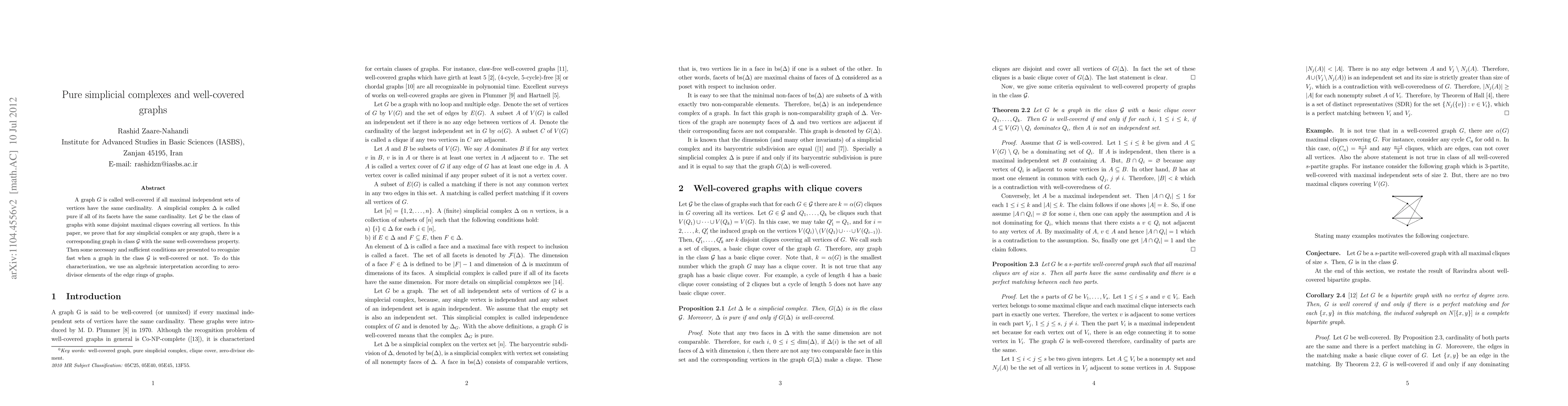 This paper establishes a correspondence between simplicial complexes and a class of well-covered graphs characterized by disjoint maximal cliques, proving that every graph has a corresponding well-covered graph in this class. It also presents necessary and sufficient conditions for recognizing well-covered graphs using zero-divisor elements in the edge rings of graphs.
