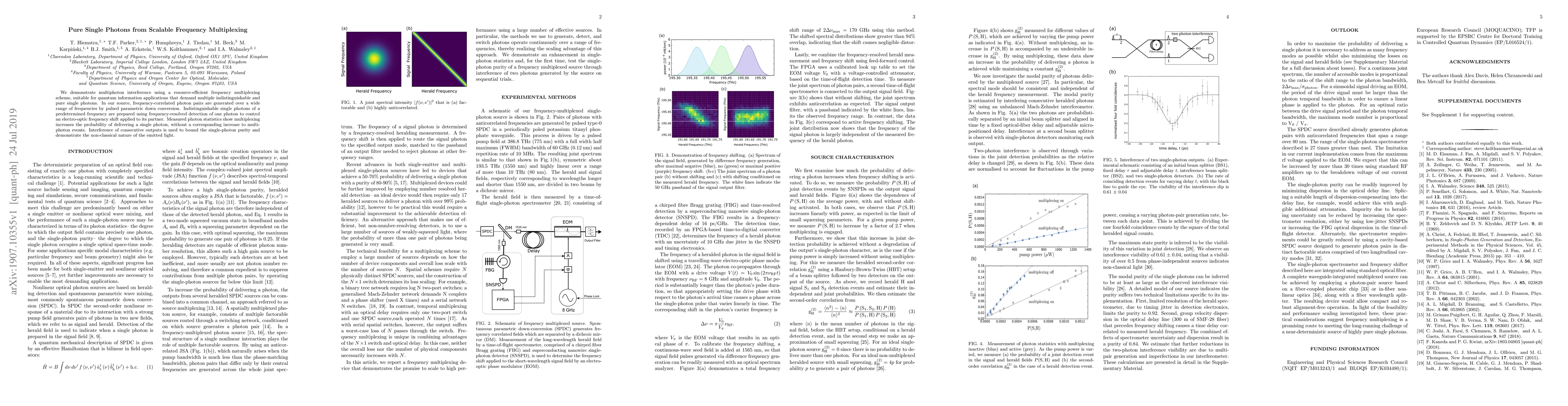 This paper presents a scalable frequency multiplexing scheme for generating pure single photons via pulsed parametric down-conversion, enhancing quantum information applications. The method ensures high purity of single photons without increasing multiphoton events, validated through multiphoton interference and statistical analysis.