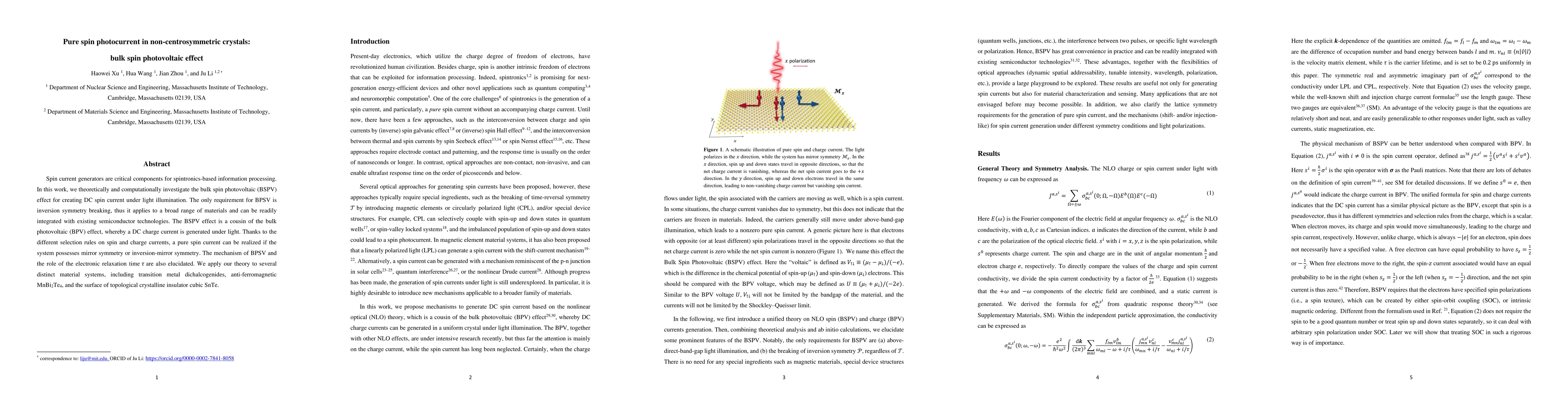 This paper investigates the bulk spin photovoltaic effect in non-centrosymmetric crystals, demonstrating how light can generate a pure spin current without charge current, applicable to a wide range of materials due to the requirement of only inversion symmetry breaking. The study elucidates the mechanism and the role of electronic relaxation time, applying the theory to various materials including transition metal dichalcogenides and topological crystalline insulators.
