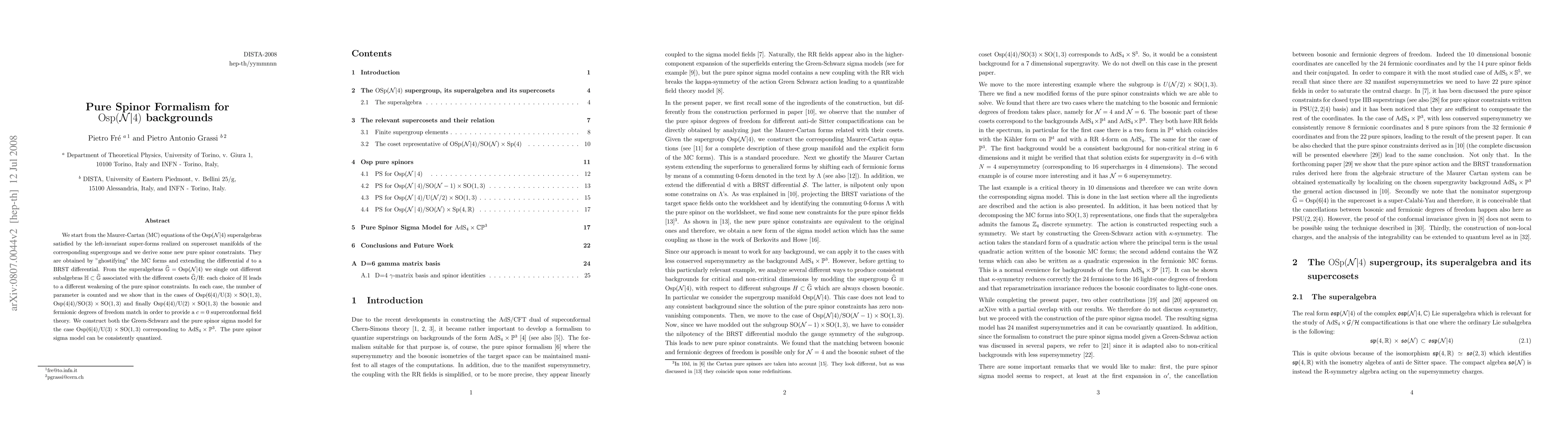 We start from the Maurer-Cartan (MC) equations of the Osp(N|4) superalgebras satisfied by the left-invariant super-forms realized on supercoset manifolds of the corresponding supergroups and we derive some new pure spinor constraints. They are obtained by "ghostifying" the MC forms and extending the differential d to a BRST differential. From the superalgebras G =Osp(N|4) we single out different subalgebras H contained in G associated with the different cosets G/H: each choice of H leads to a different weakening of the pure spinor constraints. In each case, the number of parameter is counted and we show that in the cases of Osp(6|4)/U(3) x SO(1,3), Osp(4|4)/SO(3) x SO(1,3) and finally Osp(4|4) U(2)} x SO(1,3) the bosonic and fermionic degrees of freedom match in order to provide a c=0 superconformal field theory. We construct both the Green-Schwarz and the pure spinor sigma model for the case Osp(6|4)/U(3)x SO(1,3) corresponding to AdS_4 x P^3. The pure spinor sigma model can be consistently quantized.