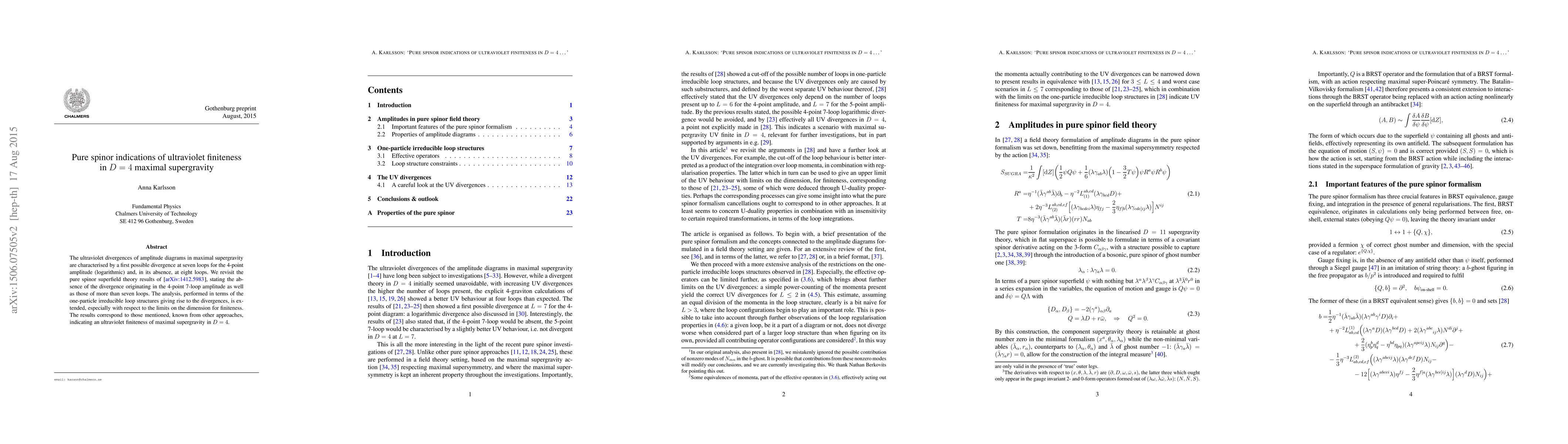 The ultraviolet divergences of amplitude diagrams in maximal supergravity are characterised by a first possible divergence at seven loops for the 4-point amplitude (logarithmic) and, in its absence, at eight loops. We revisit the pure spinor superfield theory results of [arXiv:1412.5983], stating the absence of the divergence originating in the 4-point 7-loop amplitude as well as those of more than seven loops. The analysis, performed in terms of the one-particle irreducible loop structures giving rise to the divergences, is extended, especially with respect to the limits on the dimension for finiteness. The results correspond to those mentioned, known from other approaches, indicating an ultraviolet finiteness of maximal supergravity in D=4.