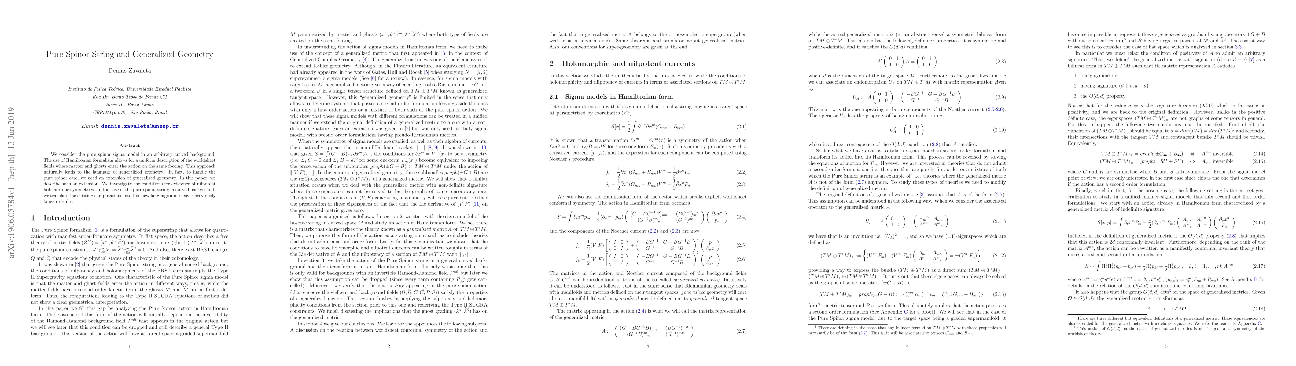 This paper extends generalized geometry to accommodate the pure spinor sigma model, employing Hamiltonian formalism to unify worldsheet fields. It investigates nilpotent holomorphic symmetries and translates existing results into this new framework.