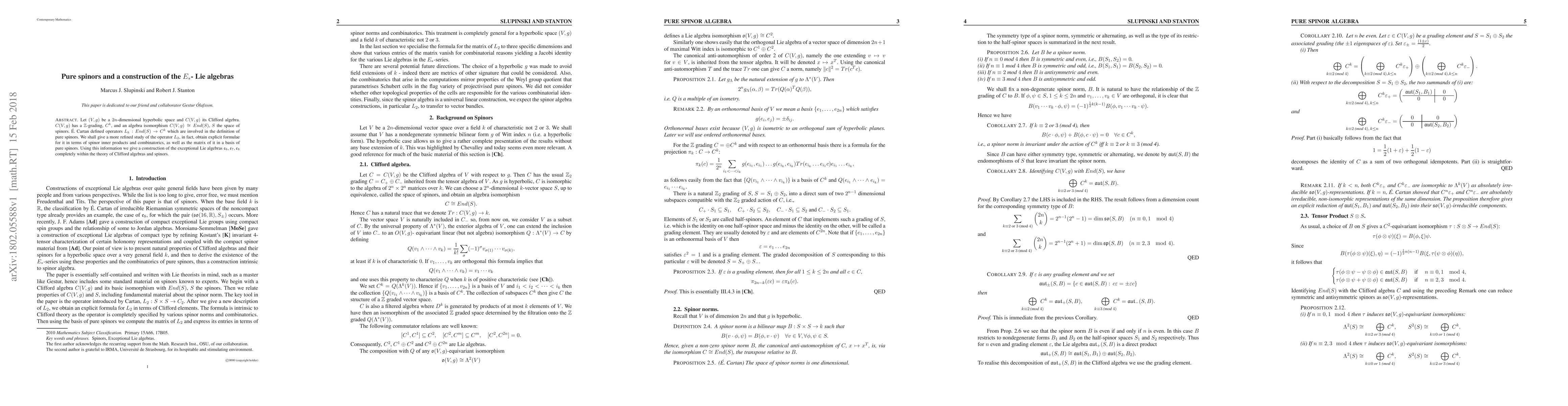 Let $(V,g)$ be a $2n$-dimensional hyperbolic space and $C(V,g)$ its Clifford algebra. $C(V,g)$ has a $\mathbb Z$-grading, $C^k $, and an algebra isomorphism $C(V,g)\cong End(S)$, $S$ the space of spinors. \'E. Cartan defined operators $L_k: End(S) \to C^k$ which are involved in the definition of pure spinors. We shall give a more refined study of the operator $L_2$, in fact, obtain explicit formulae for it in terms of spinor inner products and combinatorics, as well as the matrix of it in a basis of pure spinors. Using this information we give a construction of the exceptional Lie algebras $\mathfrak e_6, \mathfrak e_7, \mathfrak e_8$ completely within the theory of Clifford algebras and spinors.
