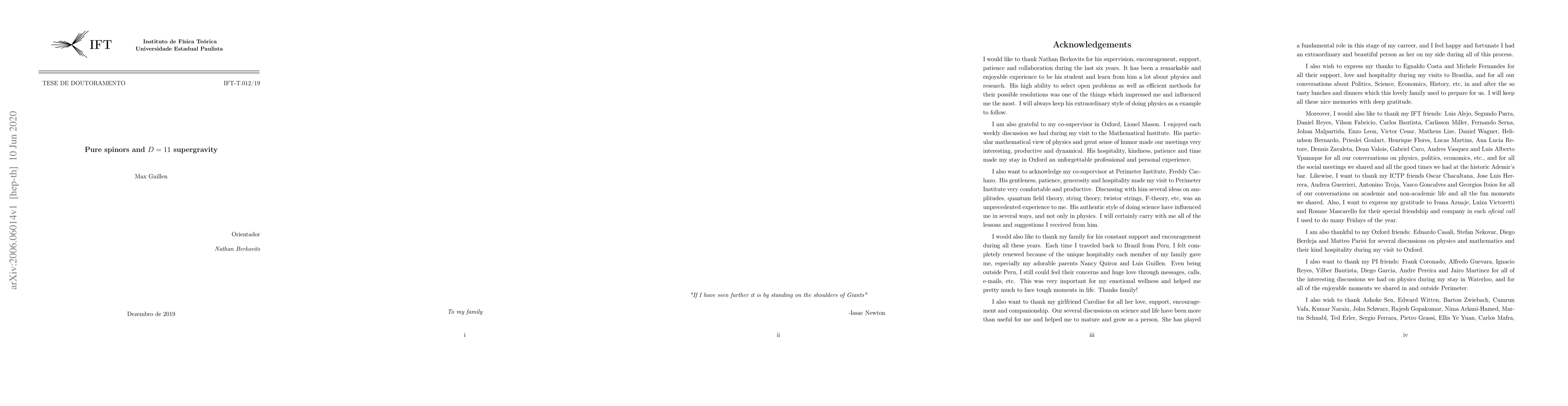 This paper investigates $D=11$ supergravity using pure spinor variables, developing a pure spinor superparticle model and deriving its linearized equations of motion in $D=9$ superspace. The study encounters complications in constructing certain vertex operators but resolves these by introducing a simplified fermionic vector, proposing an alternative ghost number zero vertex operator. Additionally, it demonstrates how pure spinor master actions describe various maximally supersymmetric gauge theories.